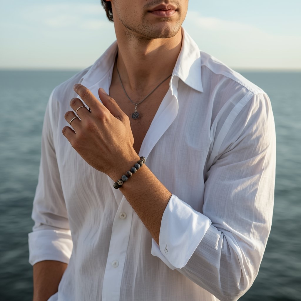 Nuestra línea masculina combina minerales naturales, madera y otros marteriales en pulseras y collares creados para hombres que buscan un estilo con carácter.