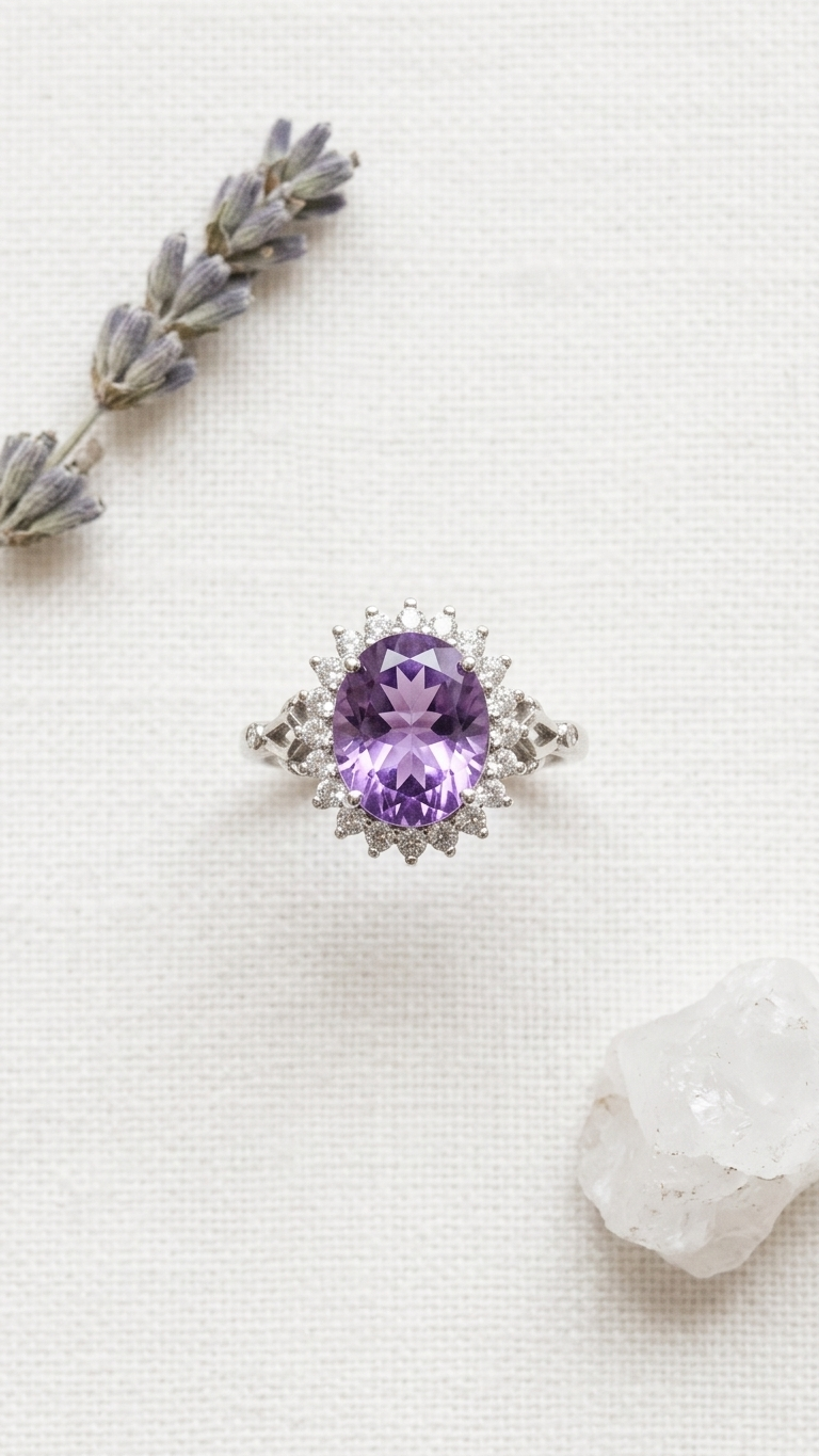 Inspirado en el resplandor de la alta joyería internacional, el modelo Velvet combina la majestuosidad de las tallas tradicionales con un brillo excepcional. La amatista, piedra de la transmutación, el equilibrio y la protección espiritual, ocupa el centro de este lote artesanal, escoltada por la vitalidad y el fuego de un halo perimetral de circonitas. Es una joya diseñada para quienes valoran lo auténtico: piezas que no necesitan brillar por exceso, sino por la verdad de sus materiales y la perfección de su simetría.
