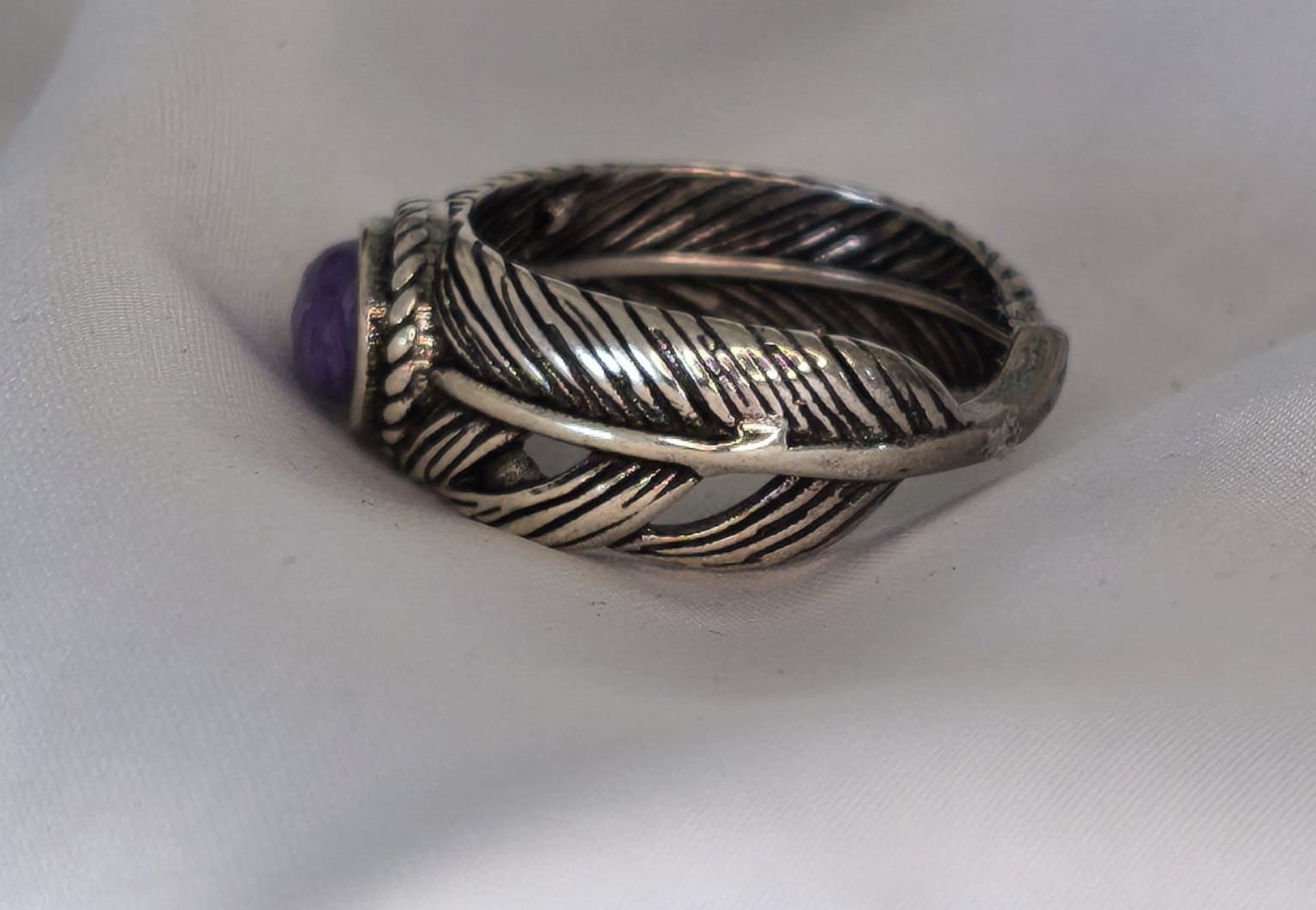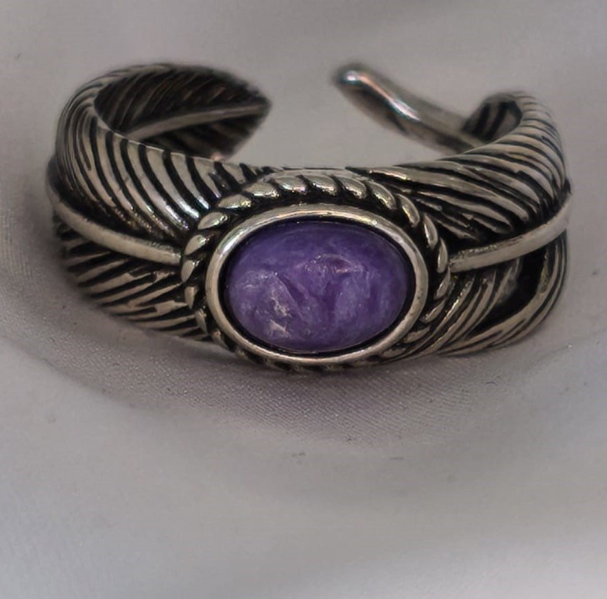 Anillo de diseño vintage con piedra natural de charoita, montada en aleación metálica de acabado cuidado en forma de pluma.