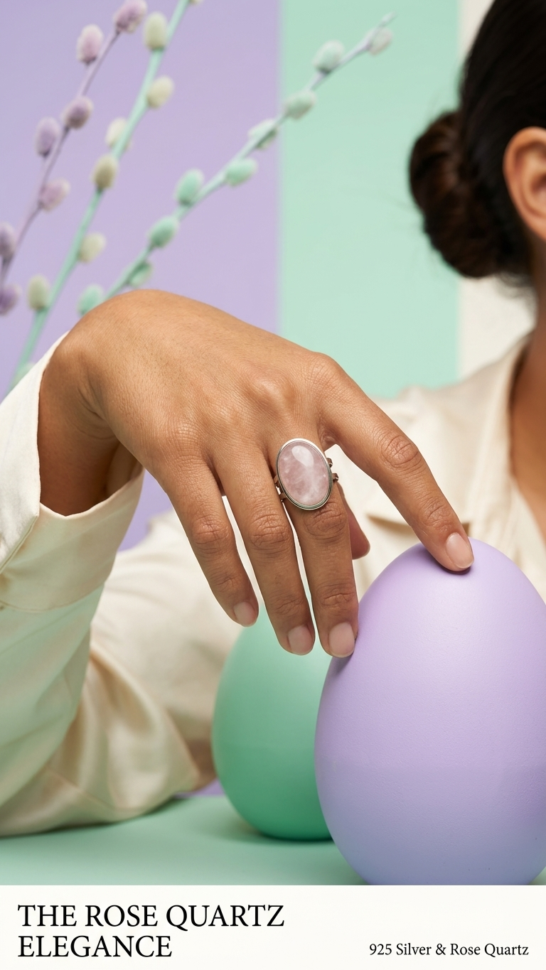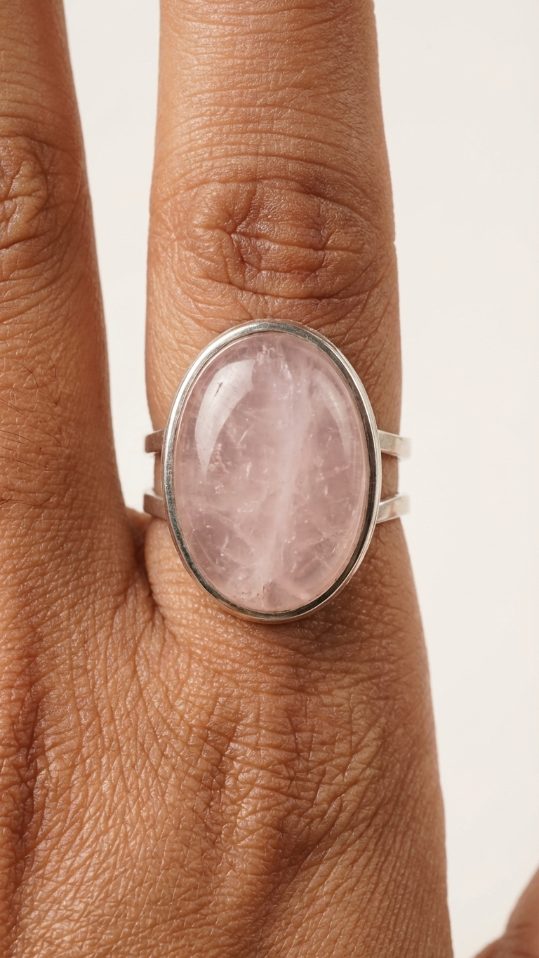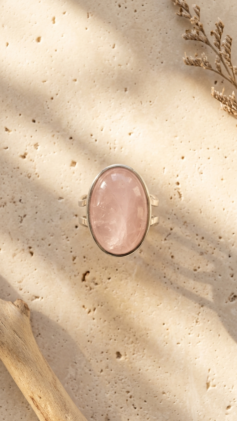 Piedras Naturales: Cuarzo rosa natural en formato cabujón ovalado, seleccionado por su tono translúcido y su superficie pulida de tacto sedoso.