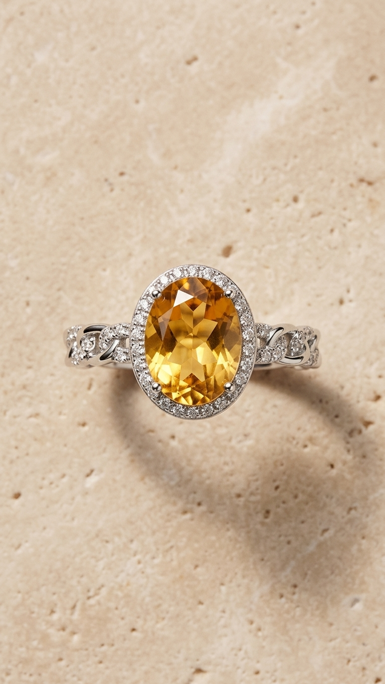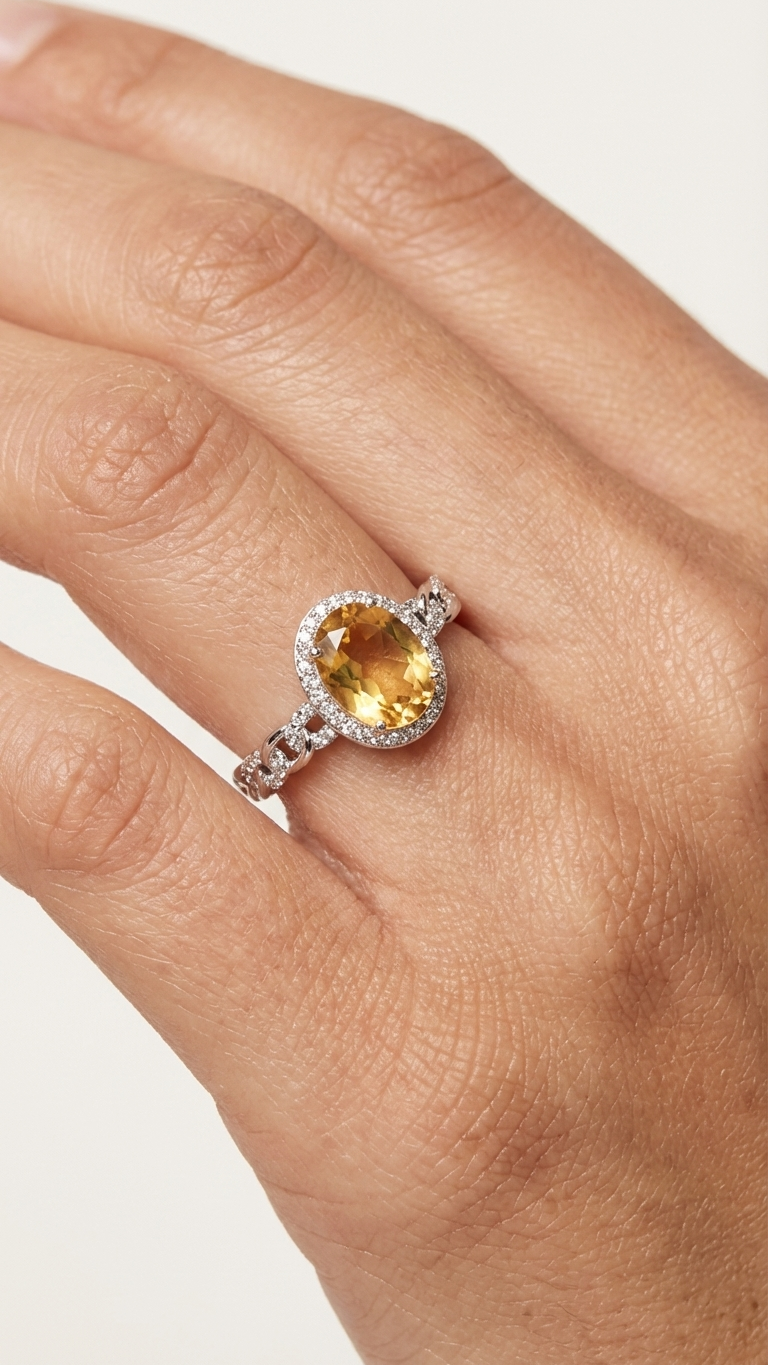 Piedras Naturales: Citrino natural de talla ovalada, seleccionado por su tono miel claro y transparencia. Orla y laterales adornados con circonitas premium para un brillo continuo.