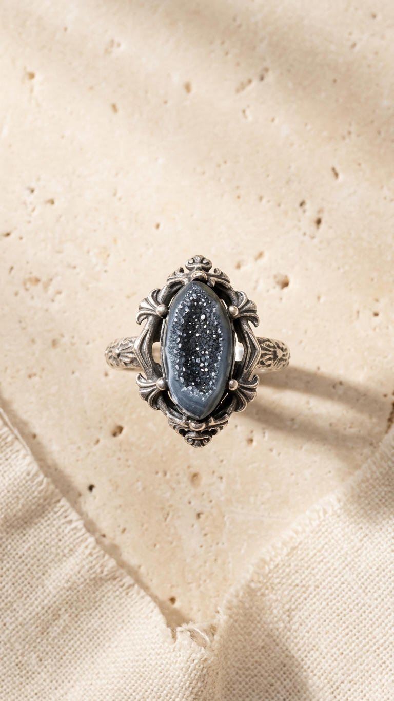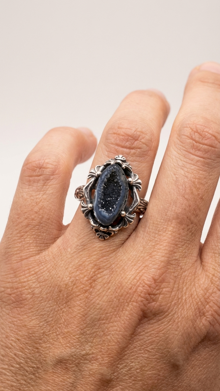 Descubre la magia de la tierra con nuestro anillo de plata de ley. Una pieza de colección protagonizada por una geoda de ágata natural con cristalización interna, engastada en una montura artesanal de estilo barroco con detalles ornamentales. Perfecto para quienes buscan una joya con alma, fuerza visual y el encanto místico de los cristales en su estado más puro.