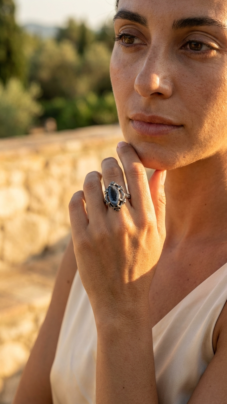 Material de Montaje: Plata de Ley 925 con acabado envejecido (pátina) para resaltar los relieves esculpidos de la banda y el bisel.
