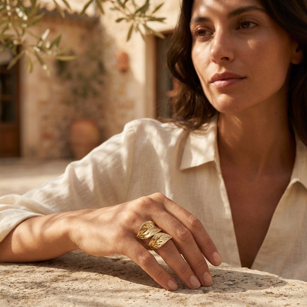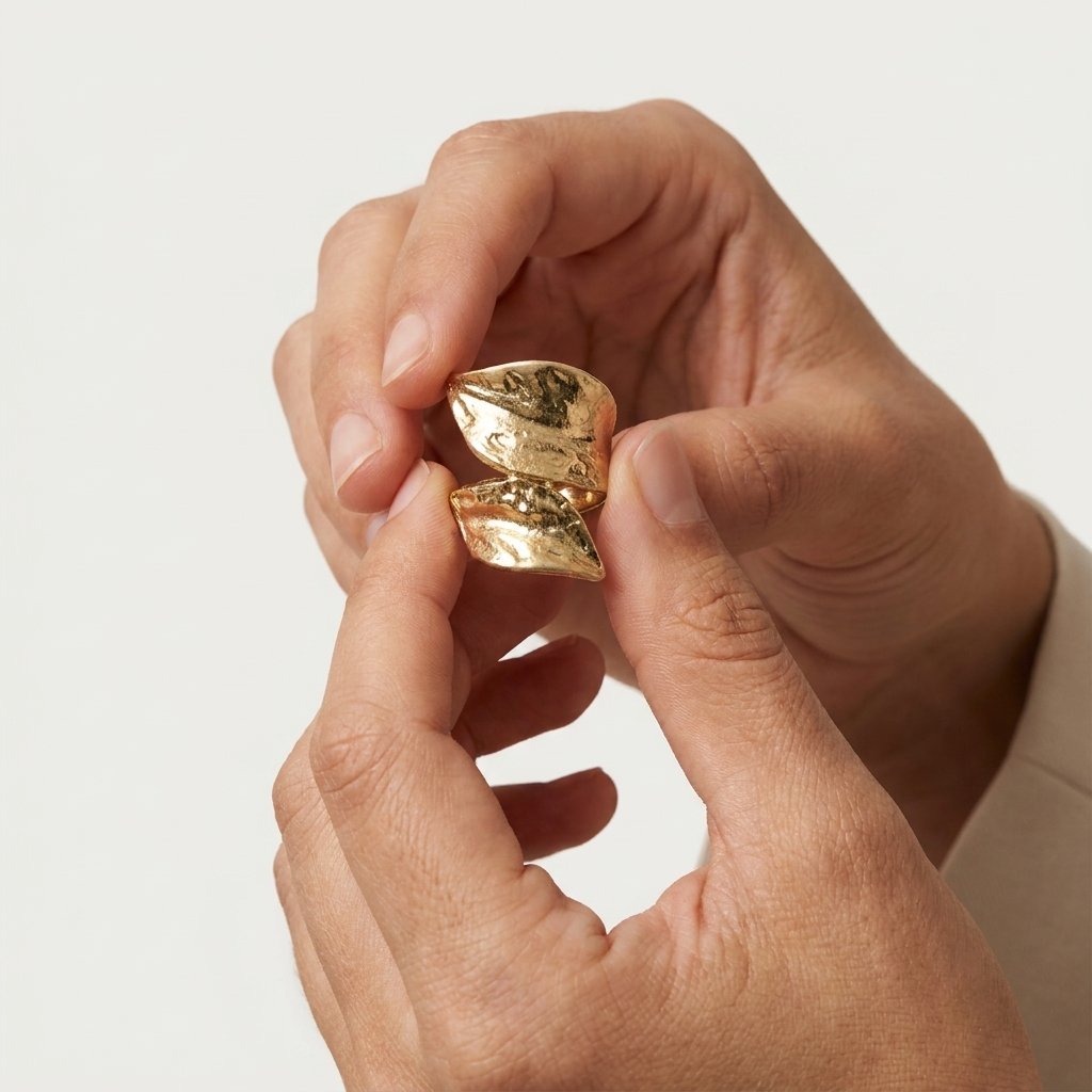 La naturaleza nunca hace dos hojas iguales. El anillo Folio lo traduce al dedo con una ingeniería tan simple como inteligente: varias piezas de acero bañado en oro con forma de hoja —textura martillada irregular, bordes orgánicos, superficie que atrapa la luz de forma distinta en cada faceta— ensambladas sobre un núcleo elástico interno que permite que el conjunto se contraiga y se expanda con total libertad.
