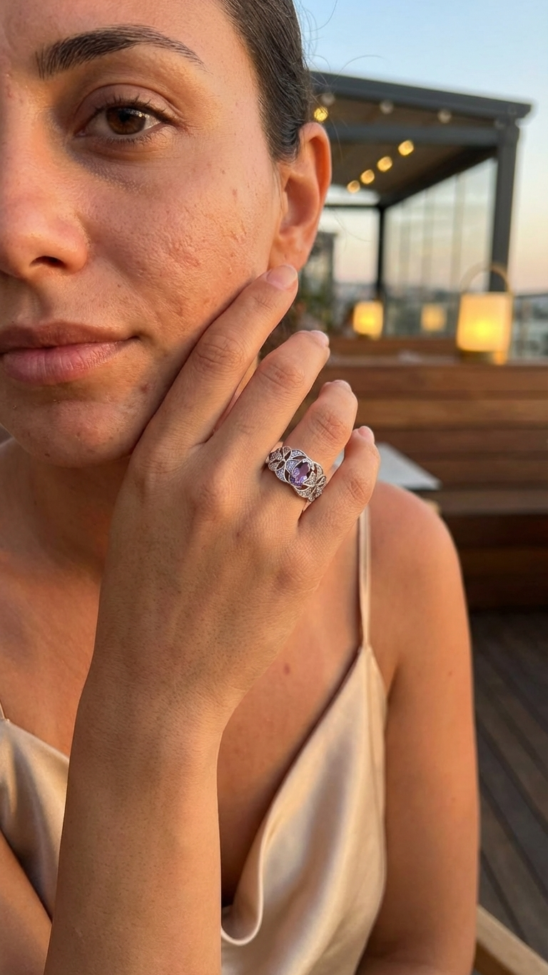 Inspirado en la elegancia etérea de la antigua Grecia, el modelo Iris combina la mística de las piedras facetadas con una estructura de orfebrería detallada. La amatista, piedra de la intuición y el equilibrio espiritual, ocupa el centro de este lote artesanal, escoltada por la vitalidad y el brillo de múltiples circonitas talladas. Es una joya diseñada para quienes valoran lo auténtico: piezas que no necesitan brillar por exceso, sino por la verdad de sus materiales y la precisión de su talla.