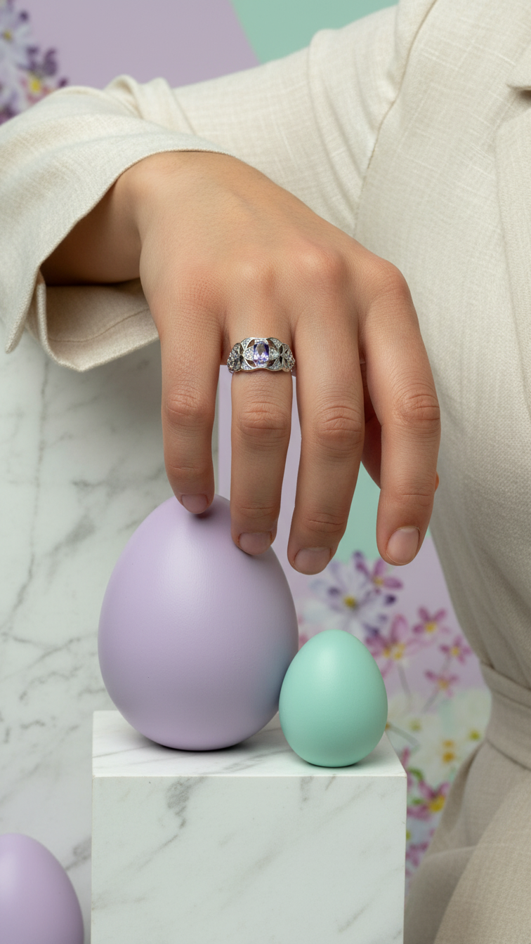 Piedras Naturales: Amatista natural facetada en formato oval central, engastada para maximizar su color violeta. Circonitas cúbicas de alta calidad en corte brillante para el pavé.