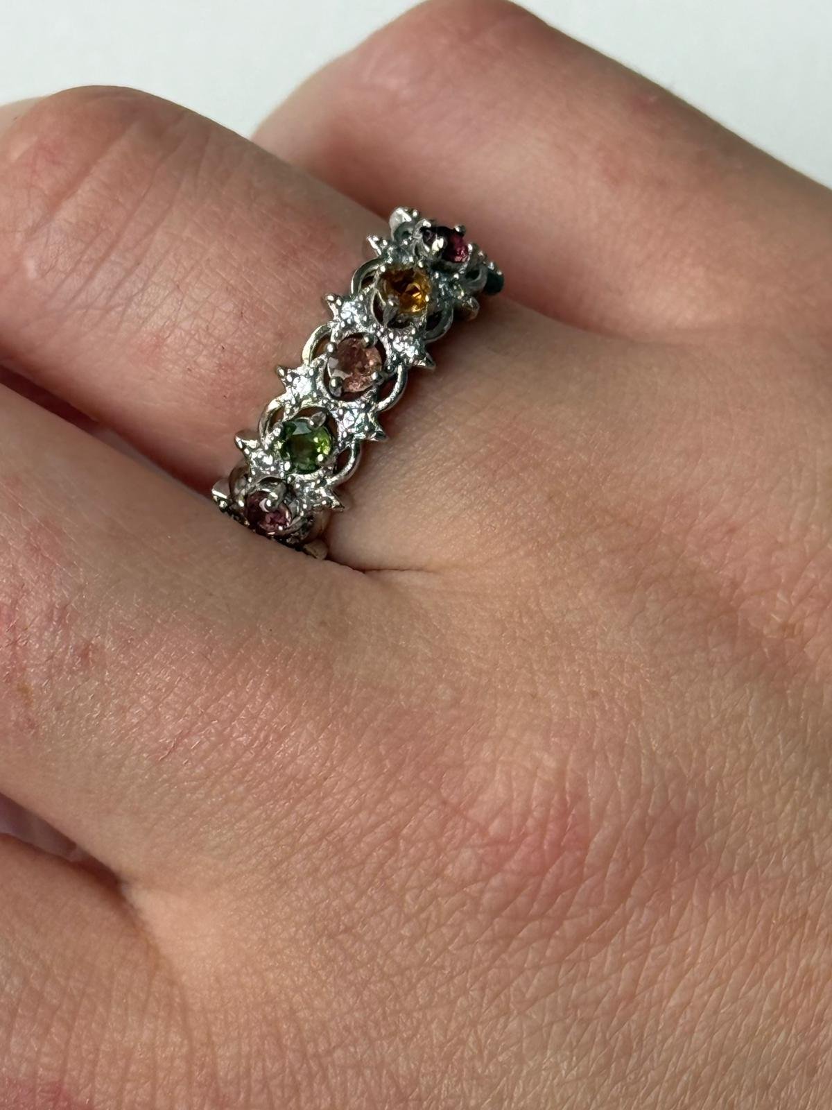 Eleva tu joyería al siguiente nivel con la elegancia de la Turmalina natural. Este anillo tipo eternity celebra la diversidad cromática de esta gema fascinante, alternando tonos verdes, rosados y ámbar que capturan la luz de forma única. Al ser piedras naturales, cada anillo cuenta su propia historia de color.
