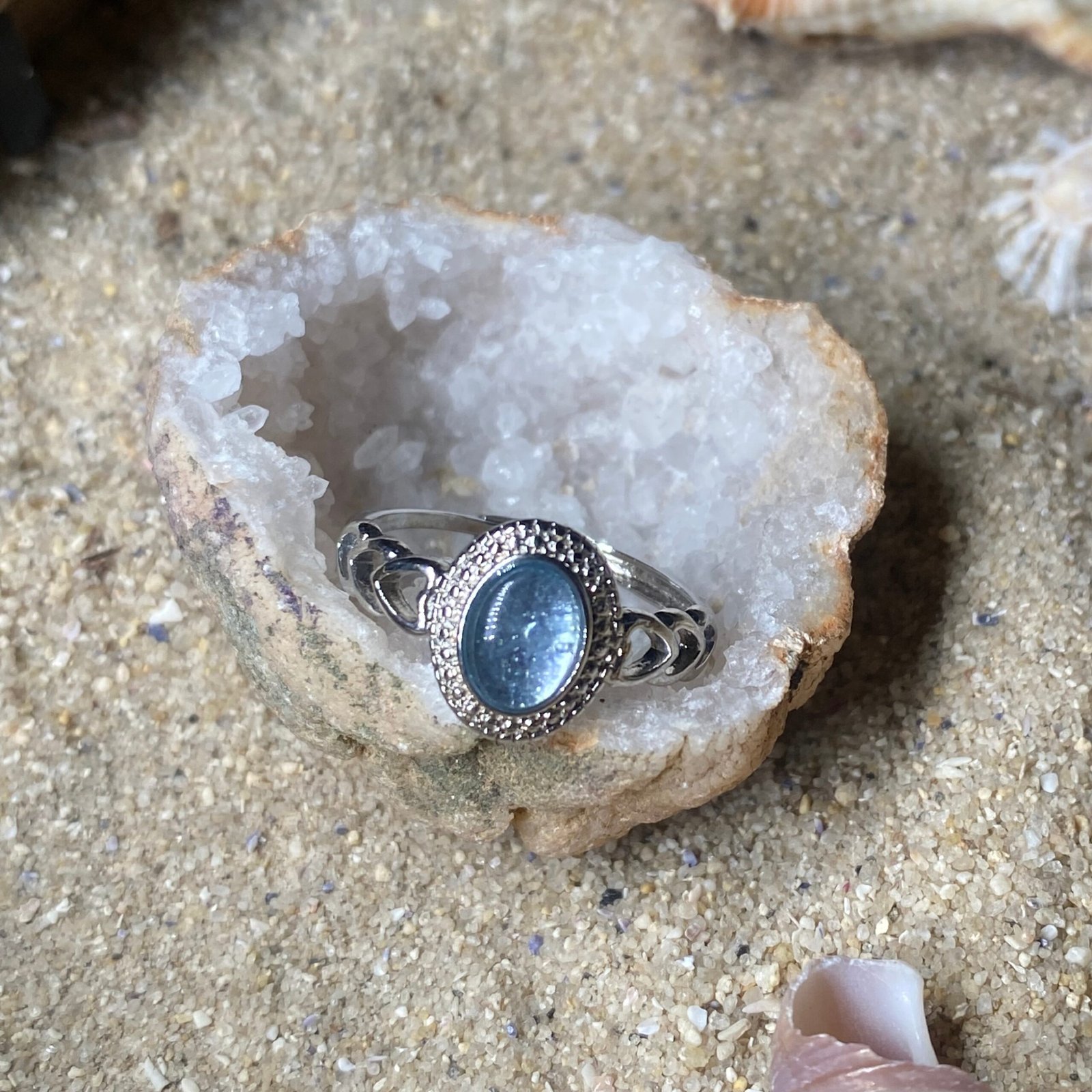 Anillo elaborado en aleación de metales con mica azul central , ajustable a varias tallas