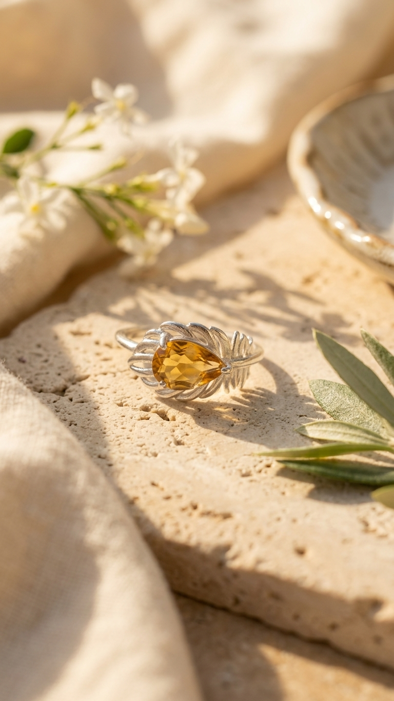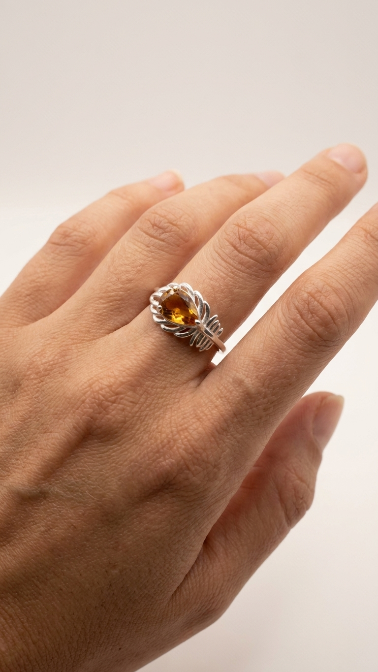 Su piedra central de citrino natural talla pera en amarillo dorado cálido y transparente queda perfectamente enmarcada por una montura artesanal en forma de pluma — con sus nervios y barbas calados en plata de ley 925 que rodean y sostienen la piedra como si fuera la punta natural de la pluma misma. Un diseño que combina lo orgánico con lo delicado, lo boho con lo refinado.
