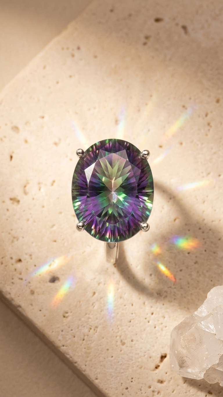 Piedras Naturales: Topacio natural con tratamiento místico en formato oval facetado, seleccionado por su brillo intenso y su gama cromática completa.