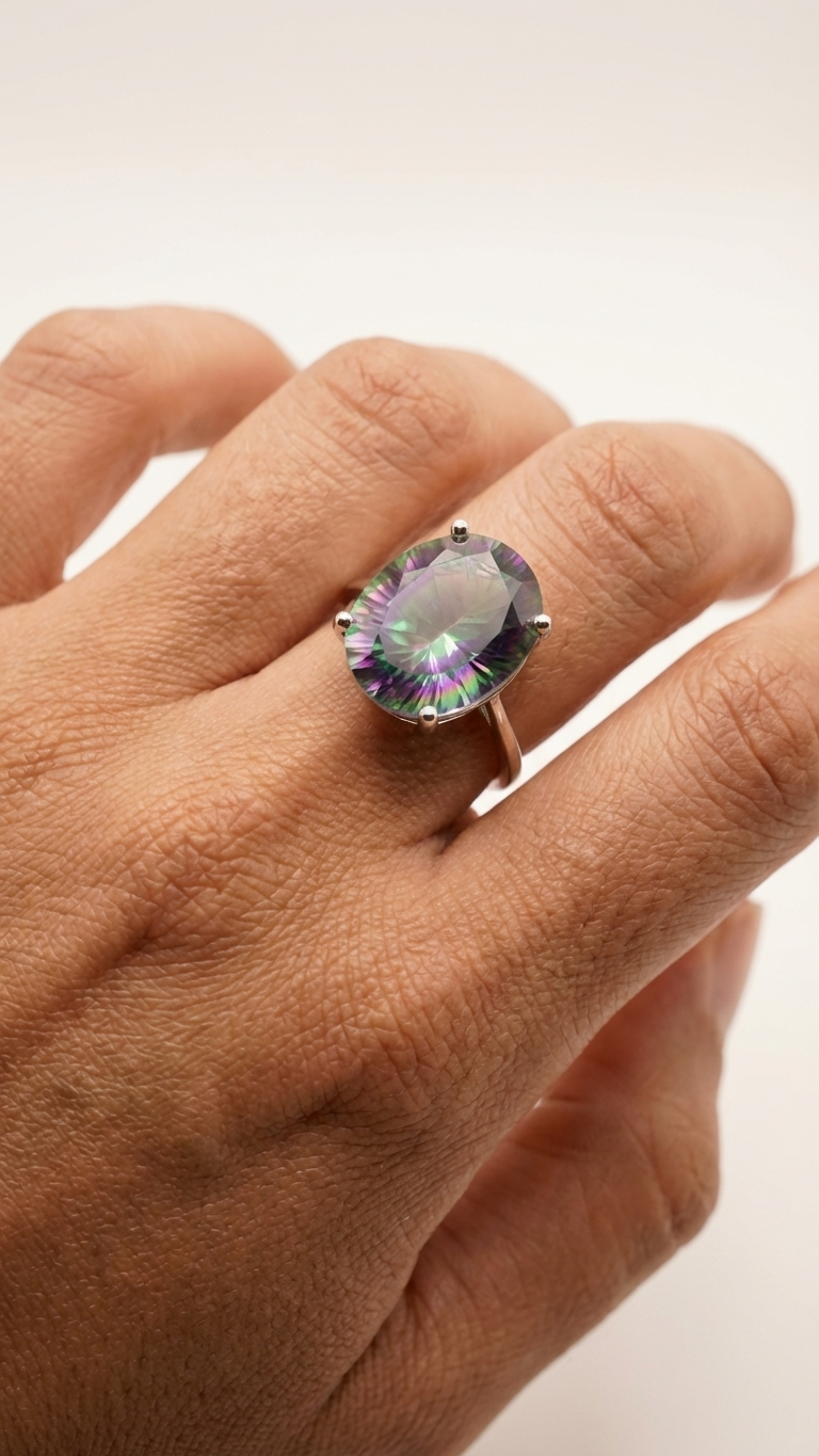 Cautiva con los reflejos infinitos de nuestro anillo ajustable de plata de ley. Una pieza de diseño imponente con un topacio místico natural de corte oval, cuya tecnología de recubrimiento crea un efecto arcoíris único. Perfecto para quienes buscan una joya que combine el misterio de los colores vibrantes con la versatilidad de una banda adaptable.