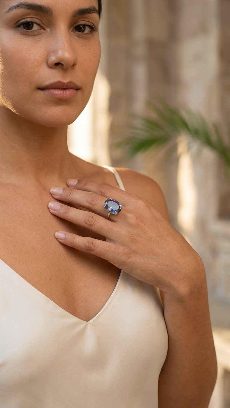 Inspirado en los colores mágicos de una noche estrellada, el modelo Aurora destaca por su capacidad de transformar la luz en un caleidoscopio de tonos púrpuras, verdes y azules. El topacio místico, piedra asociada con la creatividad, la confianza y la transmutación de energía negativa, ocupa el centro de este lote artesanal en un formato de gran tamaño que maximiza sus destellos. Su estructura de plata 925 maciza presenta una banda abierta que permite ajustar la talla con suavidad, garantizando un ajuste perfecto en cualquier dedo. Es una joya diseñada para quienes valoran lo auténtico: piezas que destacan por su audacia visual y la calidad de su orfebrería funcional.