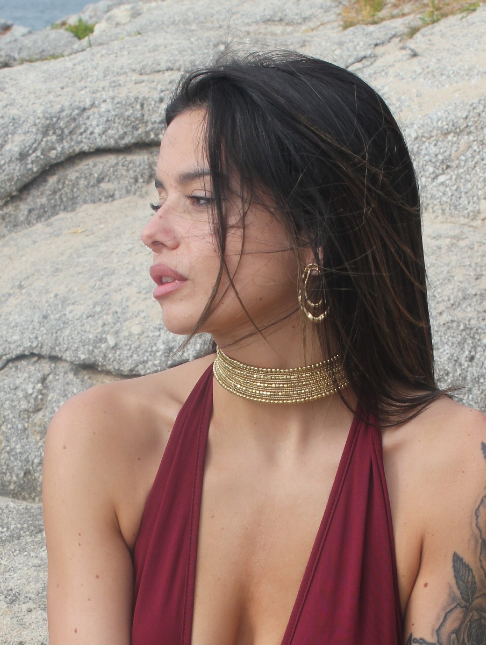 Su estructura flexible se adapta cómodamente al cuello, aportando un efecto elegante y sofisticado que realza cualquier look. Es una pieza con carácter, ideal para llevar sola como protagonista o combinada con collares más largos para un estilismo en capas.
