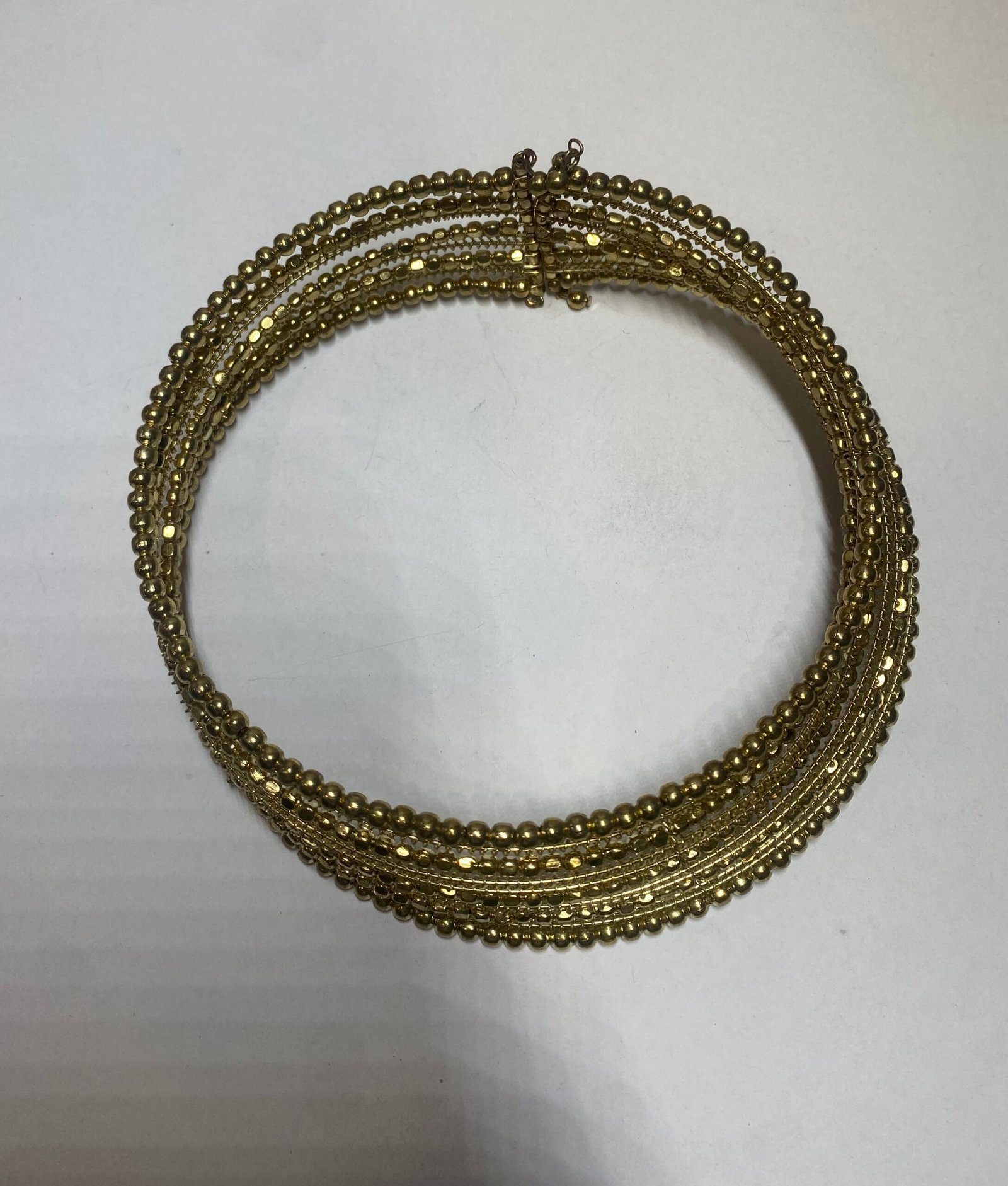 Está compuesto por múltiples líneas de cuentas metálicas en tono dorado, combinando diferentes tamaños y acabados que crean un juego de texturas y reflejos sutiles.