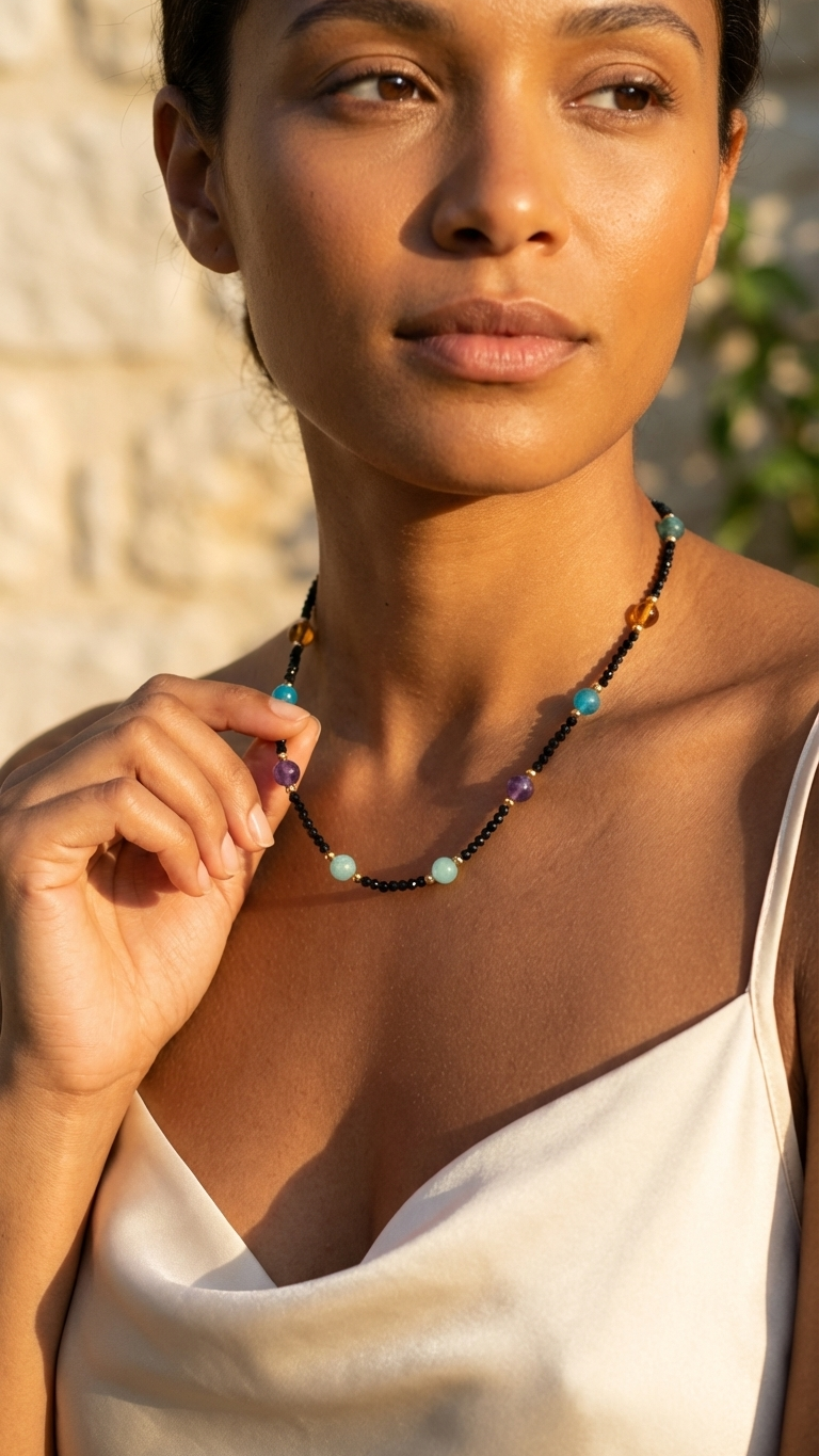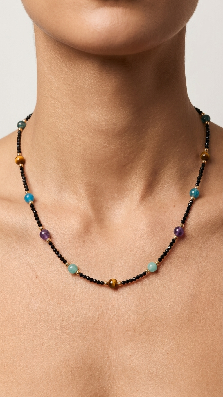 El collar Arcoíris del Alma destaca por su diseño sofisticado y minimalista. La base está compuesta por espinela negra facetada, un mineral valorado en joyería por su brillo vítreo y su durabilidad. Como contraste, se han integrado cuentas de diversas piedras naturales (Amatista, Cuarzo Rosa, Apatito, Jade, Aguamarina y Ojo de Tigre) que rompen la monotonía del negro aportando luz y un carácter multicolor.