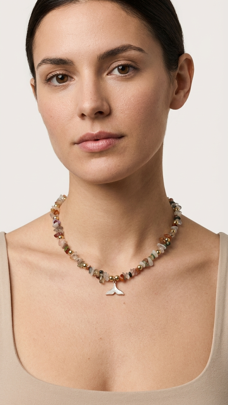 La calidez de la costa en tu piel. El Collar Arenas combina un mix de cuarzos naturales en tonos ocres, ámbar y tierra con la elegancia del acero dorado y plateado. Coronado con un dije de cola de sirena, este diseño de 40 cm es la pieza perfecta para quienes buscan un accesorio con luz propia y una conexión profunda con los elementos naturales.