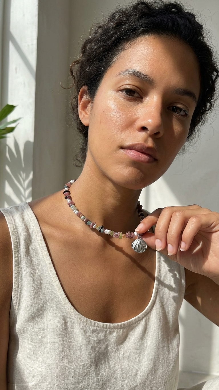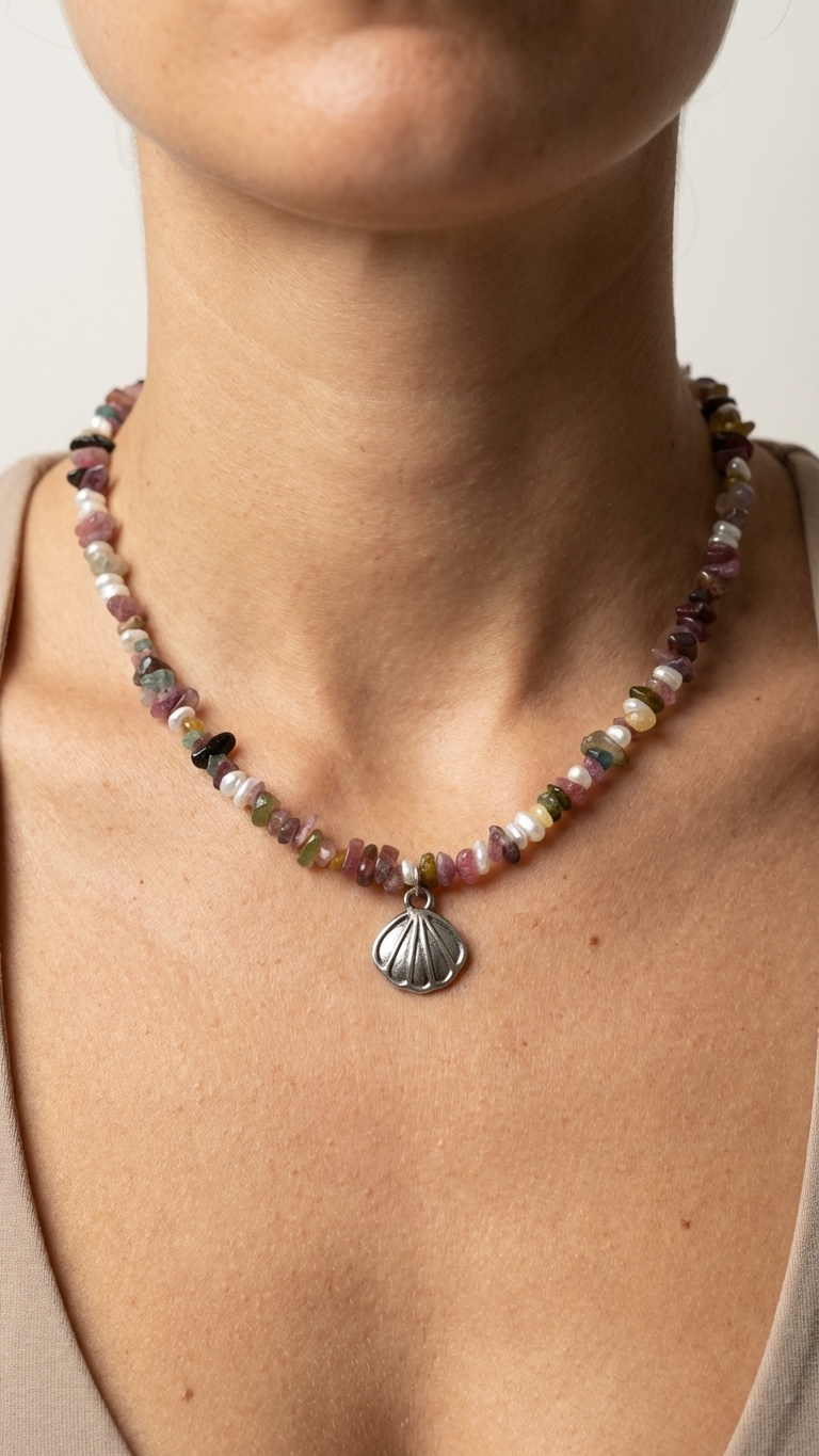 El modelo Ariel es una celebración de la diversidad. La turmalina, en sus infinitos matices naturales, se entrelaza con perlas sintéticas para crear un contraste luminoso y moderno. El toque final lo pone el dije de concha en acero inoxidable, un símbolo clásico de los tesoros marinos. Es una joya diseñada para destacar, aportando frescura y un aire bohemio a cualquier combinación de verano o diario.