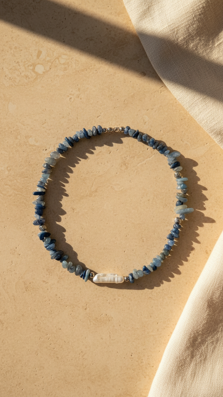 Inspirado en la suavidad de las olas rompiendo en la orilla, el modelo Bruma Marina combina la energía protectora de los minerales azules con la pureza orgánica de la perla. La aventurina azul, piedra de la paz y la auto-disciplina, y la aguamarina, piedra de la coraje y la comunicación, fluyen en una textura única a lo largo de este lote artesanal, escoltadas por una perla de río central y detalles en acero inoxidable. Es una joya diseñada para quienes valoran lo auténtico: piezas que no necesitan brillar por exceso, sino por la verdad de sus materiales.