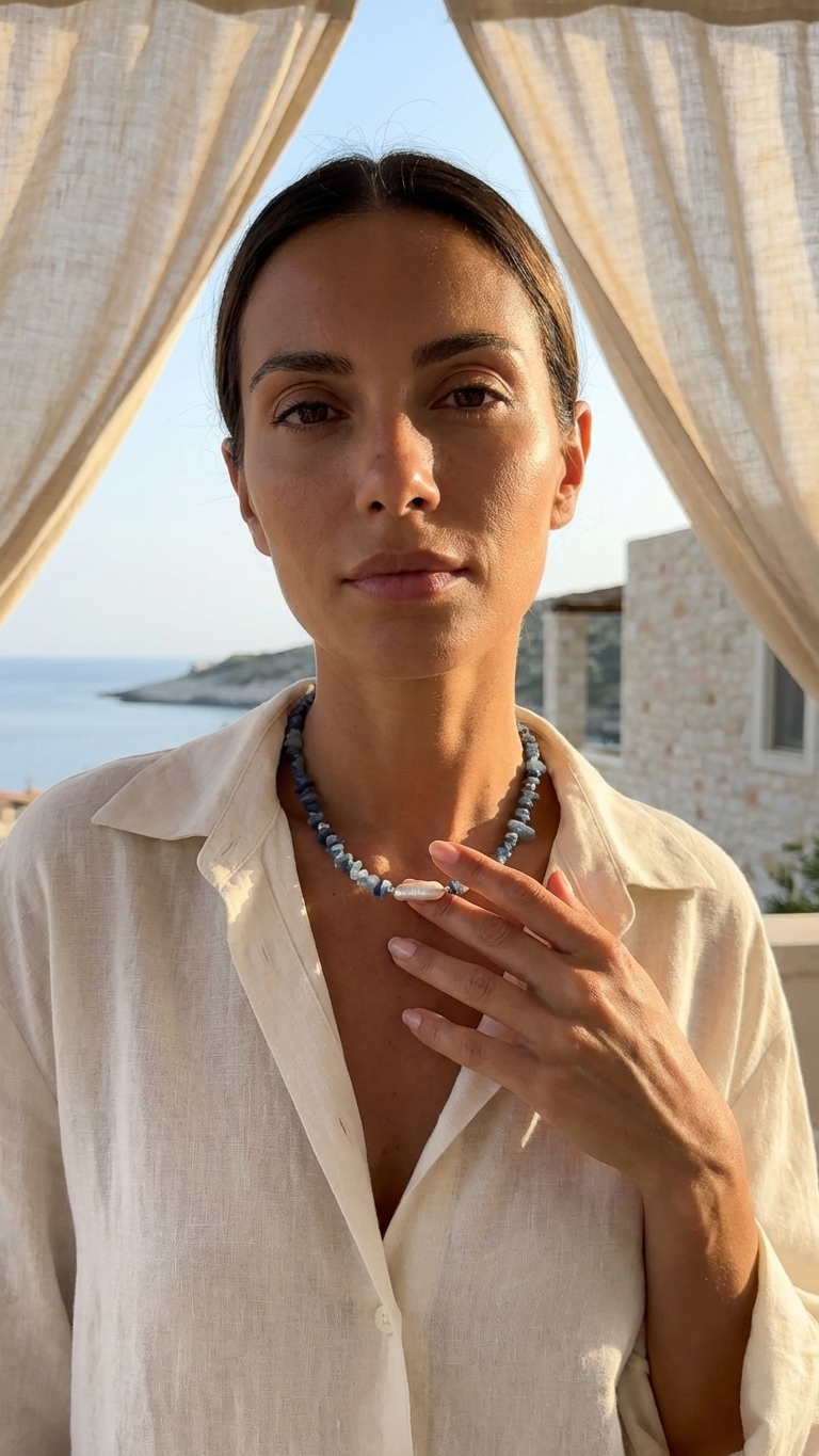 FILOSOFÍA AMARÉ Hecho a mano en nuestro taller, cada collar Bruma Marina es irrepetible. Al trabajar con piedras en bruto e irregulares y perlas naturales, esta imagen es una referencia visual; el tamaño, tono, forma de las cuentas y la perla pueden variar según la elaboración, garantizando que recibas una pieza única, tan natural como tú misma.