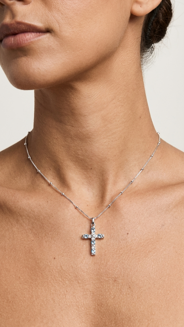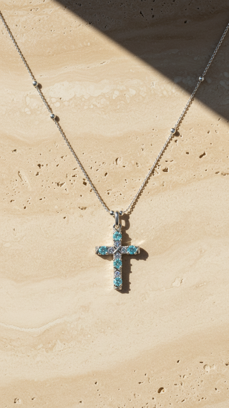 El colgante en forma de cruz está engastado con topacios azules, que aportan luz, brillo y un tono sereno inspirado en el azul del mar y el cielo.
