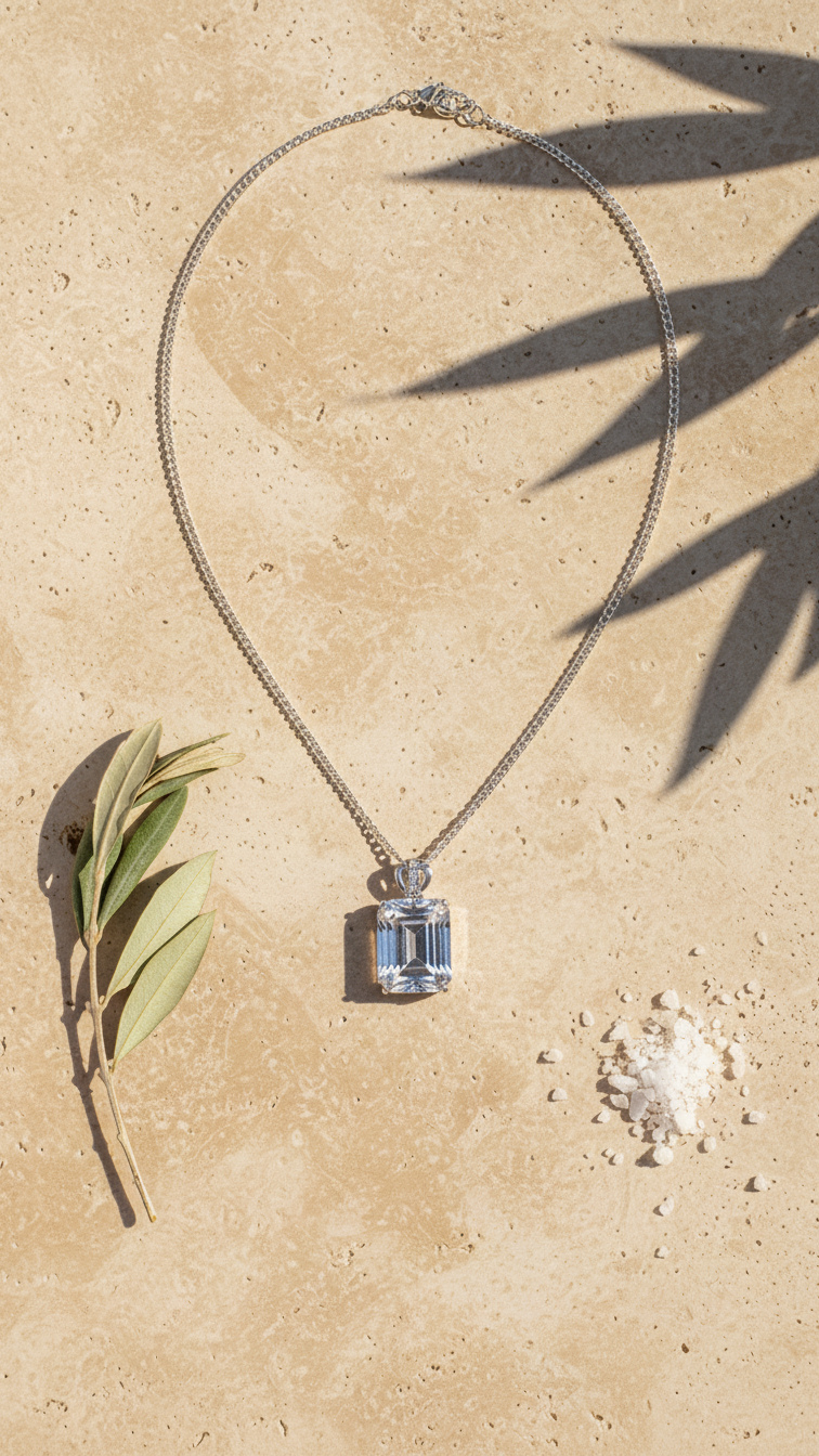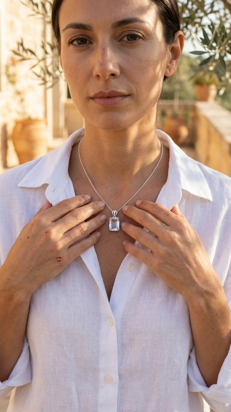 Este collar destaca por su cuarzo blanco natural tallado en forma rectangular, una pieza de líneas limpias y sofisticadas que aporta luz y equilibrio al conjunto. El colgante cuelga de una cadena de plata de ley 925, creando una joya atemporal, versátil y fácil de combinar.