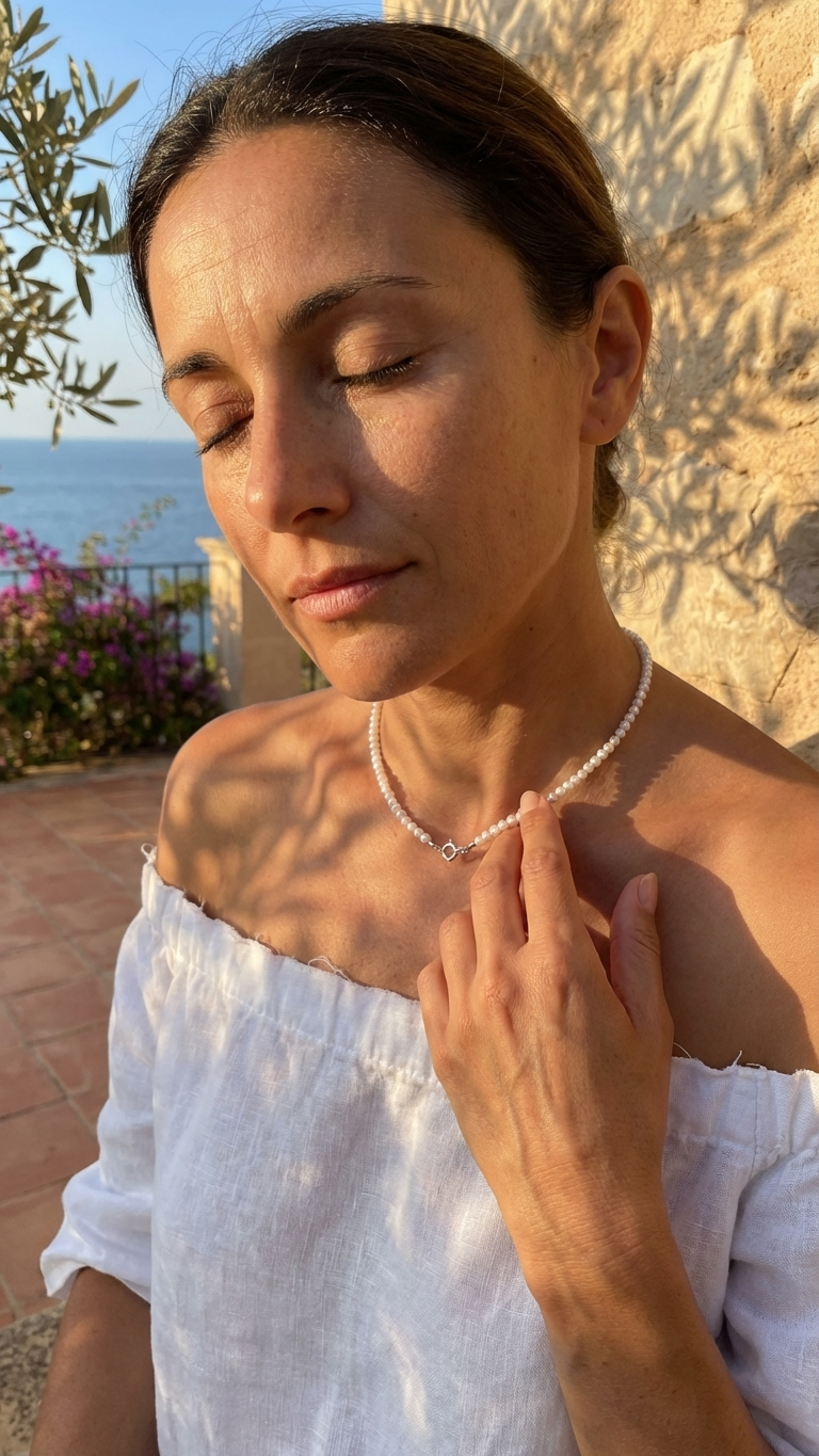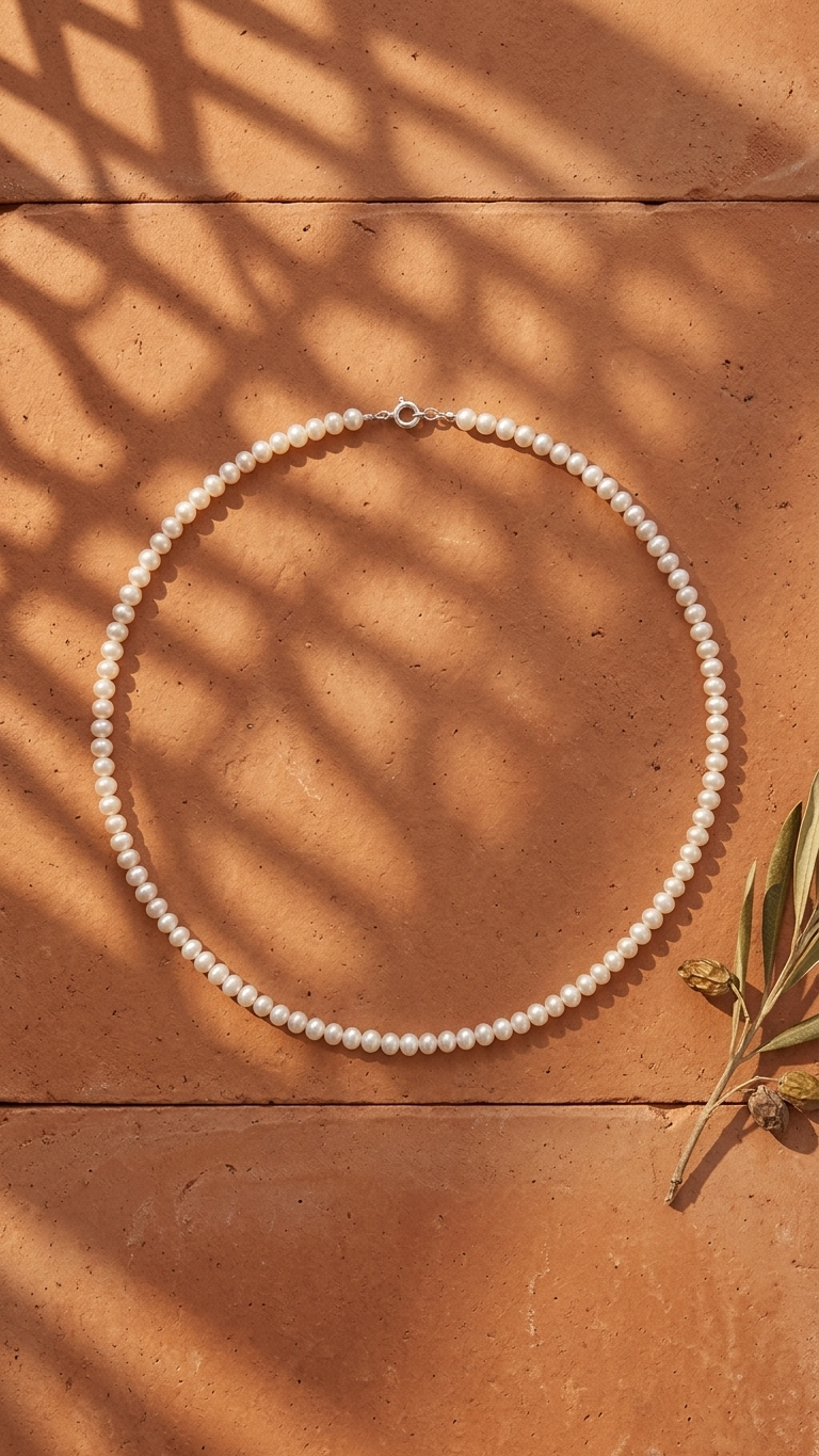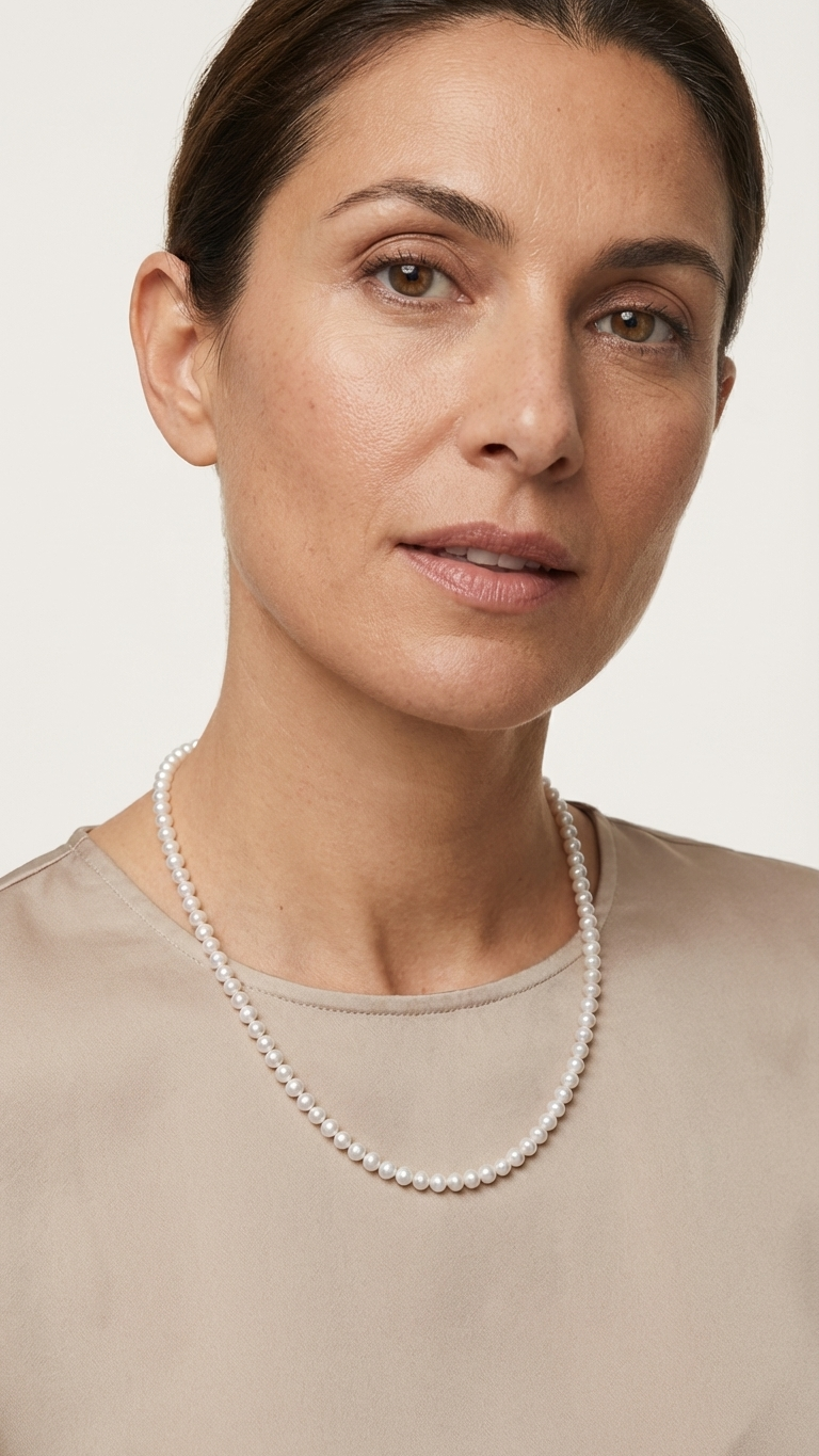 Hay piezas que no siguen tendencias porque están por encima de ellas. El modelo Luna es un collar de hilo completo de perlas de río cultivadas, seleccionadas una a una por su uniformidad de tamaño y su brillo cálido y natural, que va del blanco marfil al crema suave según cómo las toque la luz.