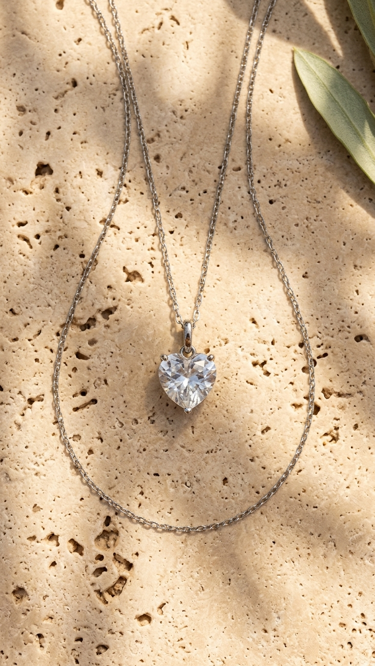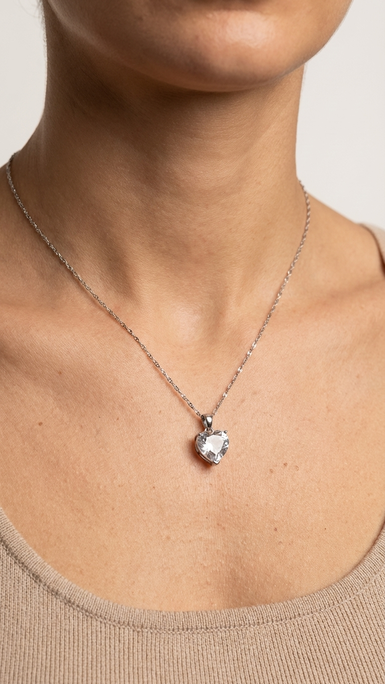 Delicadeza en estado puro. El modelo Alma presenta un colgante de corazón en cuarzo blanco natural facetado, engastado en plata y suspendido de una cadena doble fina. Una joya minimalista y luminosa para llevar cerca del corazón cada día.