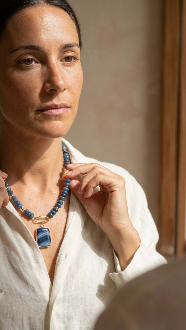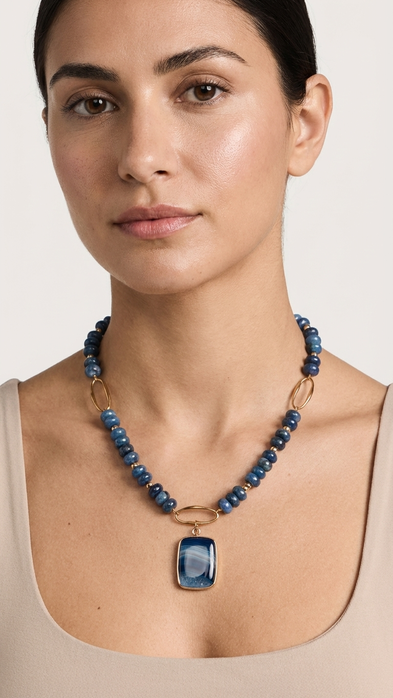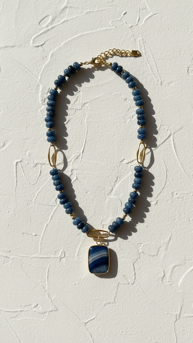 Inspirado en la profundidad del océano en calma, el modelo Índigo combina la serenidad de los minerales azules con la estructura geométrica moderna. La aventurina azul, piedra de la paz interior y la disciplina, fluye a lo largo de este lote artesanal, escoltada por un colgante central de ágata bandeada. Es una joya diseñada para quienes valoran lo auténtico: piezas que no necesitan brillar por exceso, sino por la verdad de sus materiales.