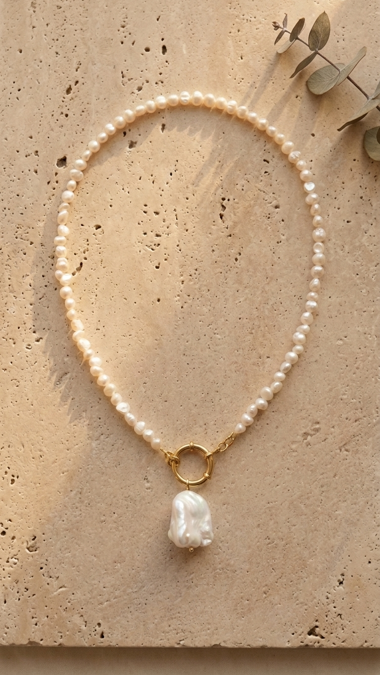 Collar artesanal de perlas de río mini naturales con colgante de perla barroca XXL y cierre anilla marinera en acero inoxidable bañado en oro 14k. Blanco nacarado puro de máxima elegancia. 40 cm + extensión.