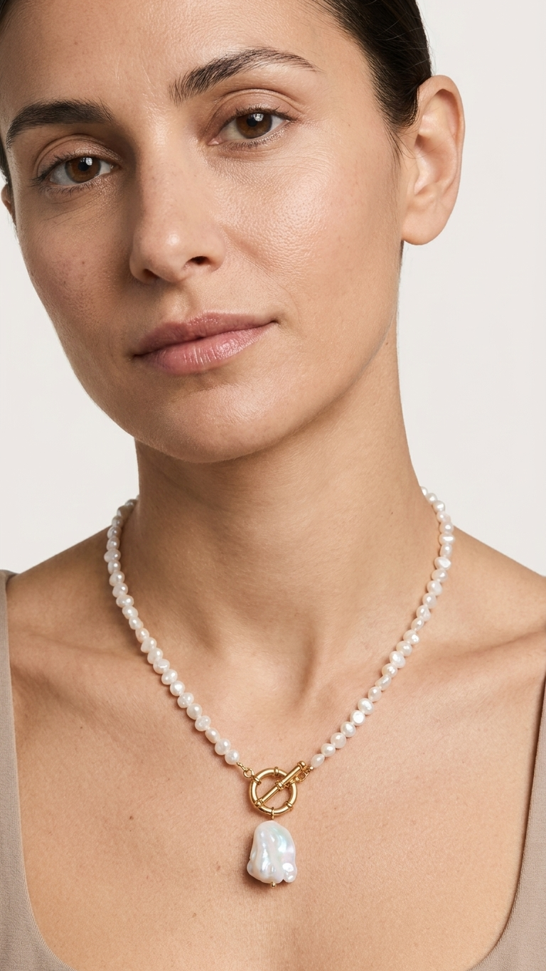 En el centro, una anilla marinera de acero bañado en oro 14k —dorada, con ese acabado que convierte el punto de cierre en un elemento de diseño— sostiene la pieza que lo justifica todo: una perla barroca de gran formato, voluminosa, completamente irregular, con esa superficie ondulada que parece esculpida por el agua y ese nácar blanco profundo con destellos crema que ninguna perla sintética puede imitar. Cuelga libre, con movimiento propio, como si acabara de emerger del fondo del río.
