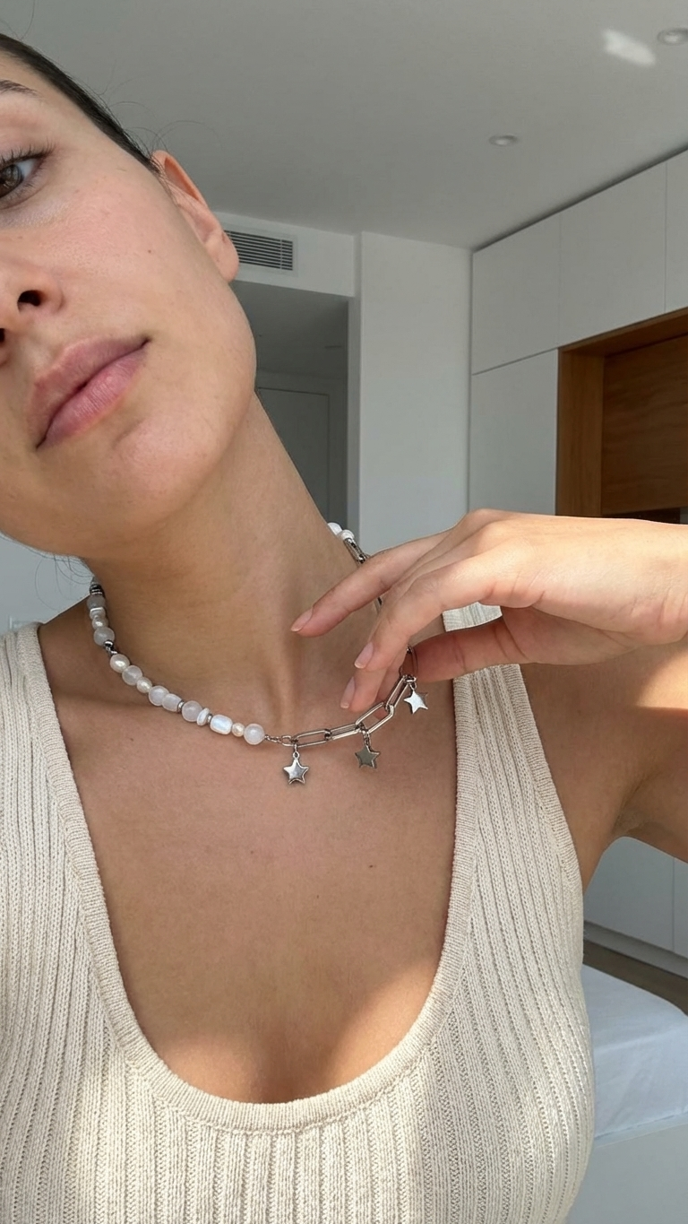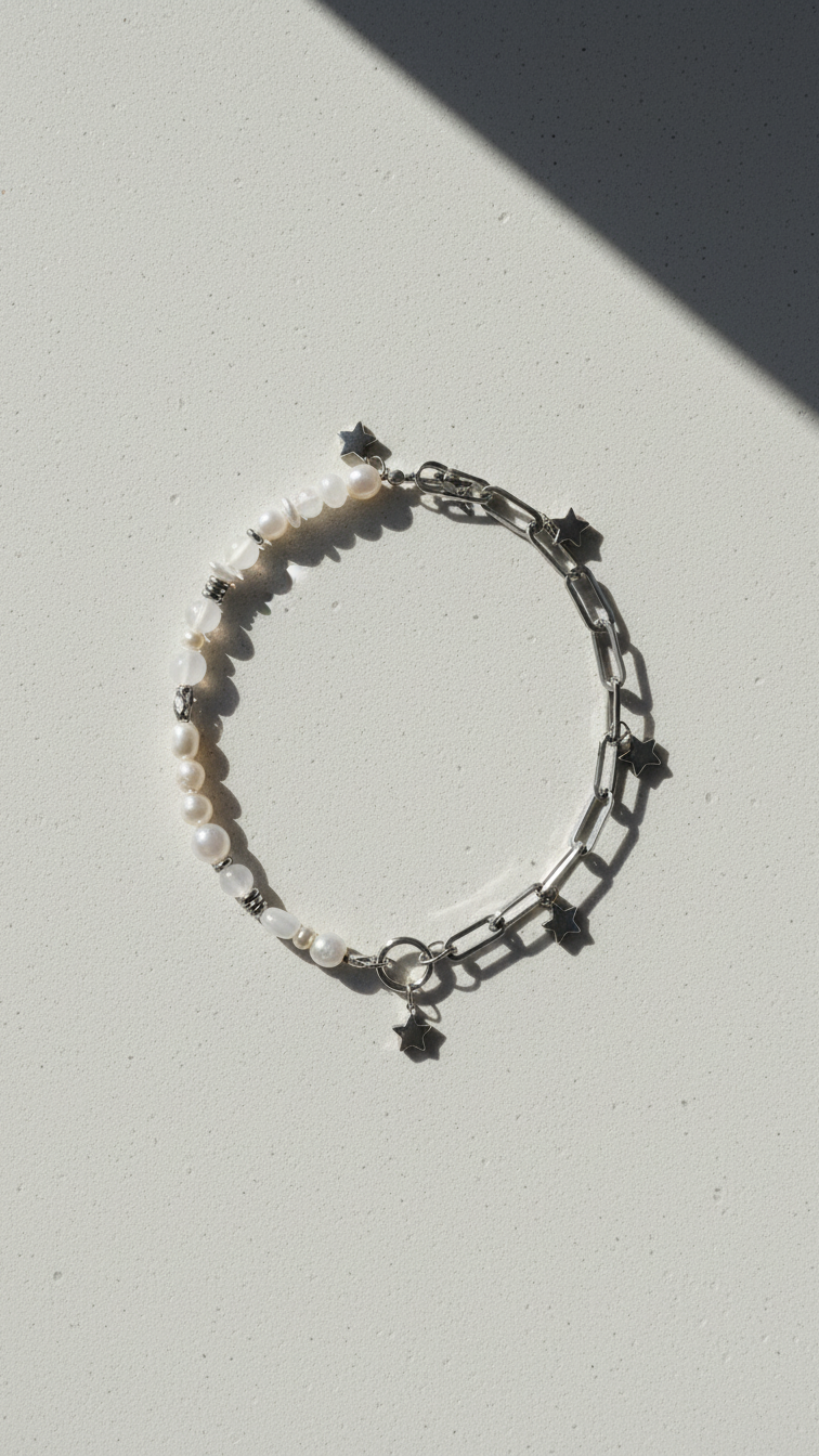 La mitad derecha cambia de registro por completo: una cadena paperclip de acero inoxidable plateado de la que cuelgan tres charms de estrella en distintas alturas, aportando movimiento y ese punto de juego que equilibra la serenidad mineral del otro lado.