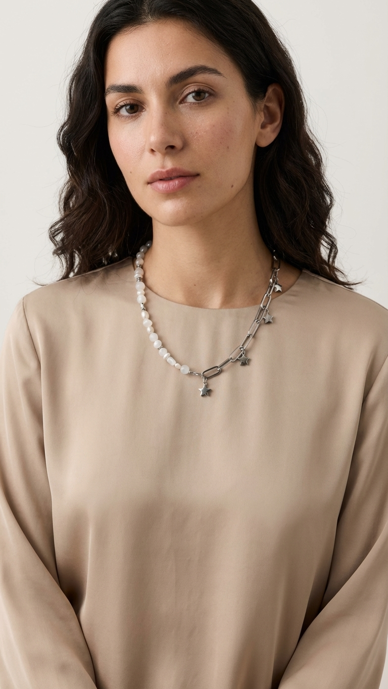 Collar asimétrico artesanal que combina perlas de río naturales, cuarzo blanco y selenita con cadena paperclip y charms de estrella en acero inoxidable plateado. Diseño half & half de 40 cm, luminoso y con personalidad. Joyería de piedras naturales para llevar cada día.