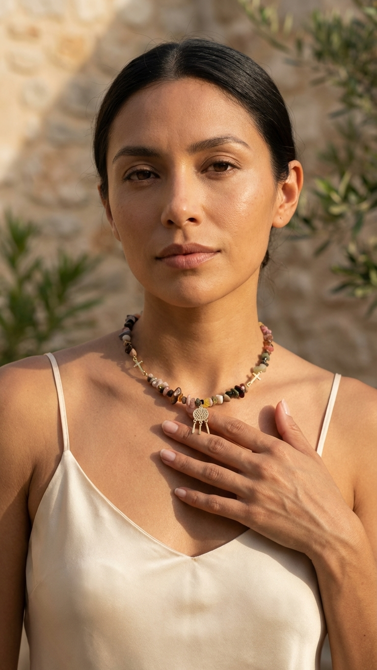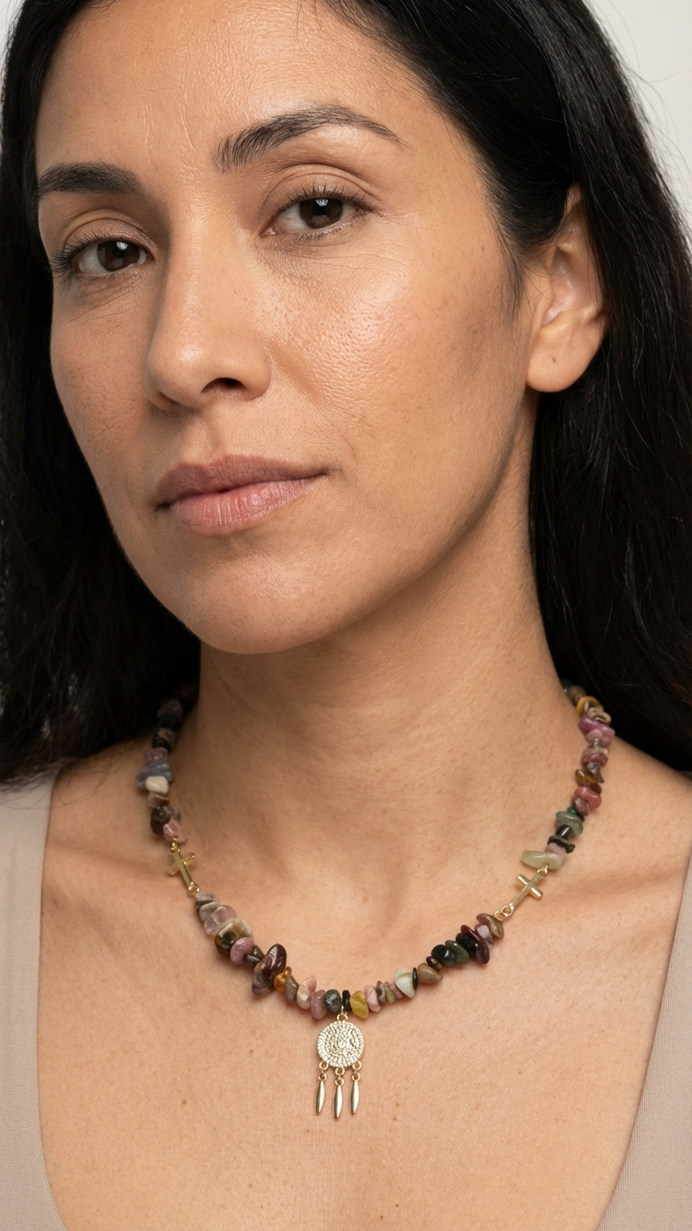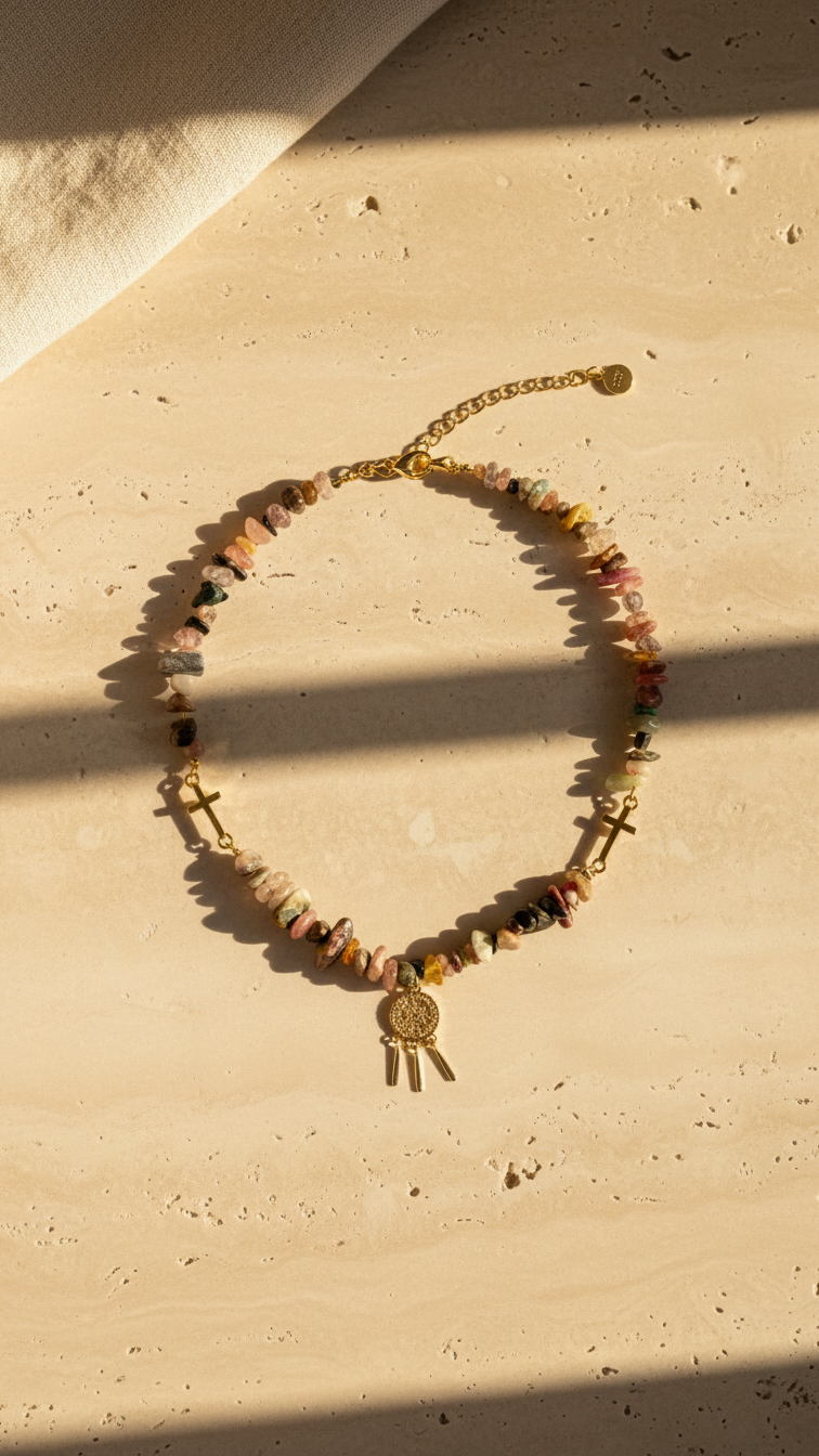 El modelo Místico fusiona la belleza orgánica de los “chips” de turmalina, que evocan los colores de los arrecifes de coral, con la fuerza de los símbolos atemporales. Dos cruces asimétricas se entrelazan entre las piedras, mientras que un charm central de acero texturizado corona el diseño, convirtiéndolo en un verdadero amuleto de protección y equilibrio. Su largo de 40 cm lo sitúa justo en la base del cuello, capturando la luz con cada movimiento.