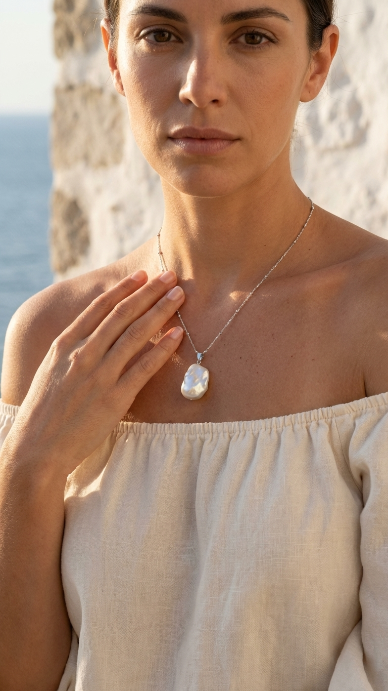 No hay dos iguales. Esa es precisamente la razón de ser del modelo Barroca: una única perla de río de gran formato, con esa forma orgánica e irregular que solo da el crecimiento natural, convertida en el centro absoluto de una pieza minimalista y poderosa.