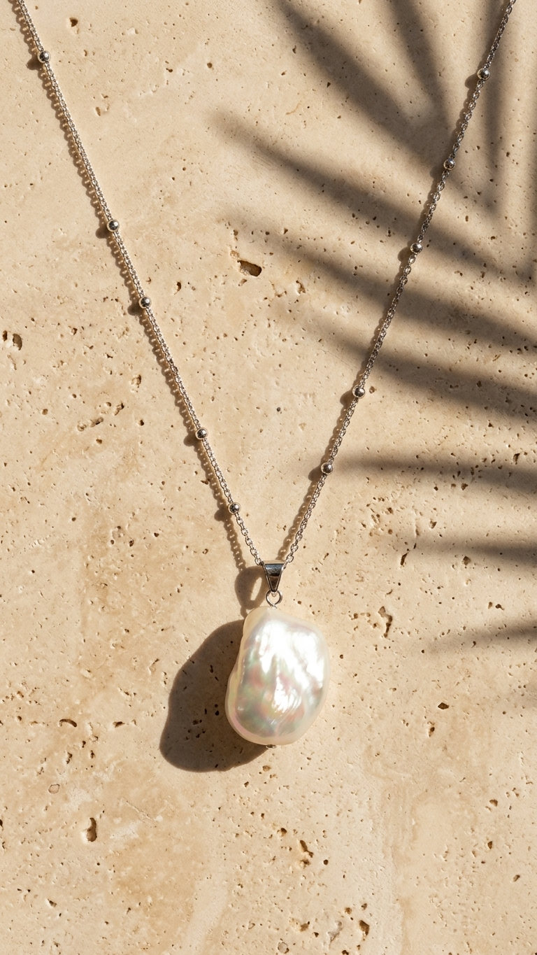 Una sola perla. Todo el protagonismo. El modelo Barroca presenta una perla de río barroca de gran formato como colgante único, suspendida de una cadena satélite fina en plata de ley de 45 cm. Irrepetible por naturaleza.
