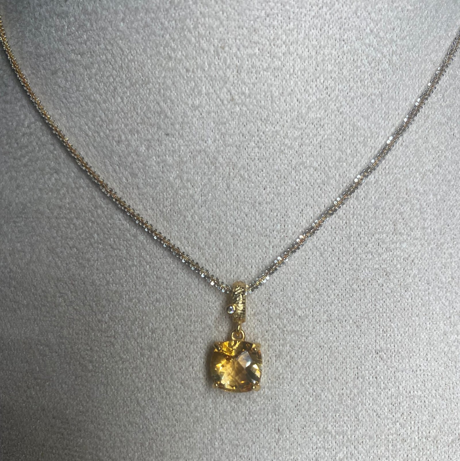 Luz, calidez y diseño en una sola pieza. Nuestro collar destaca por su impresionante citrino natural facetado, montado en un colgante de plata con baño de oro. Se complementa con una sofisticada cadena trenzada bicolor de 40 cm más 5 cm de extensión, ideal para ajustar el brillo a tu medida exacta.