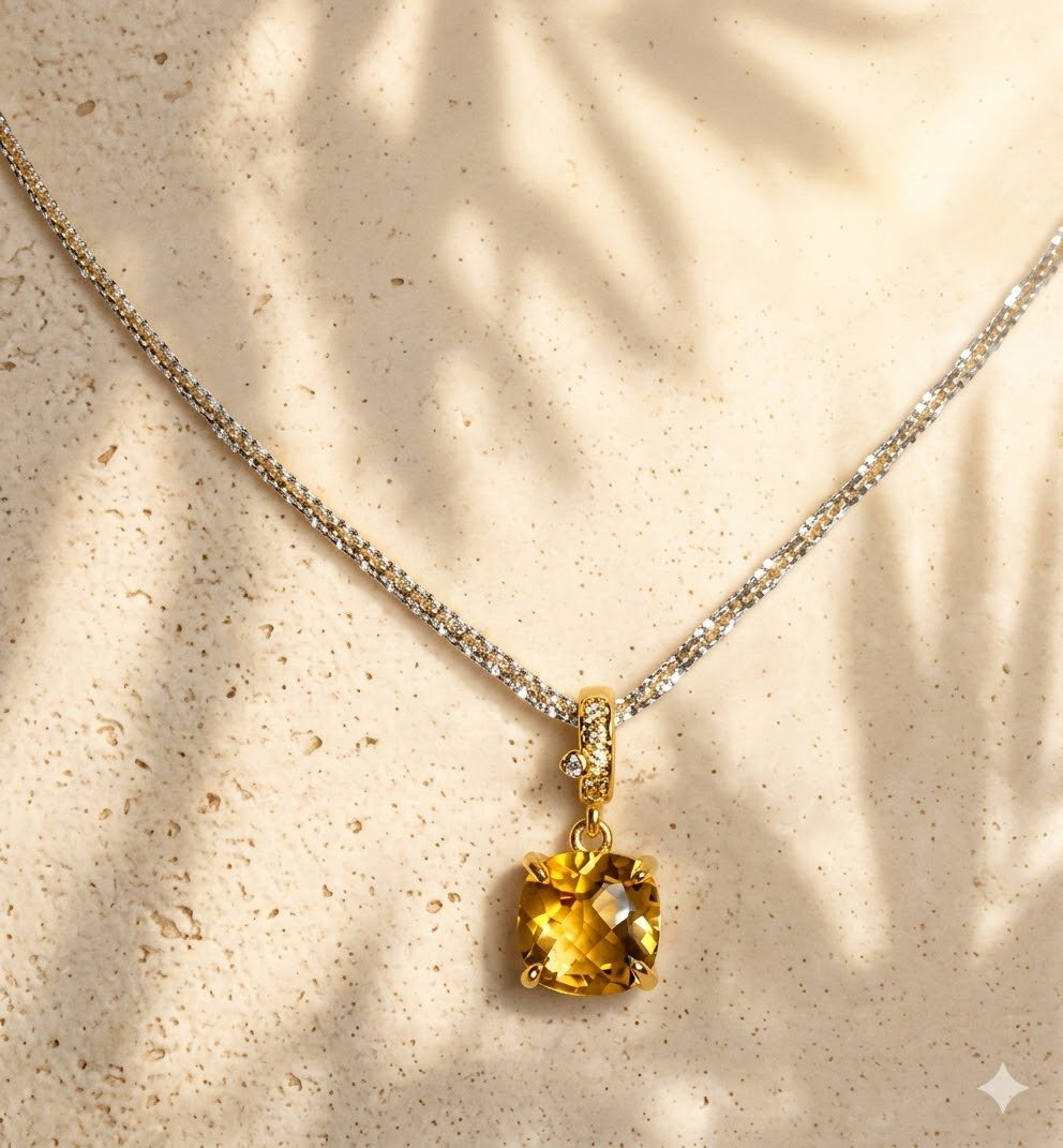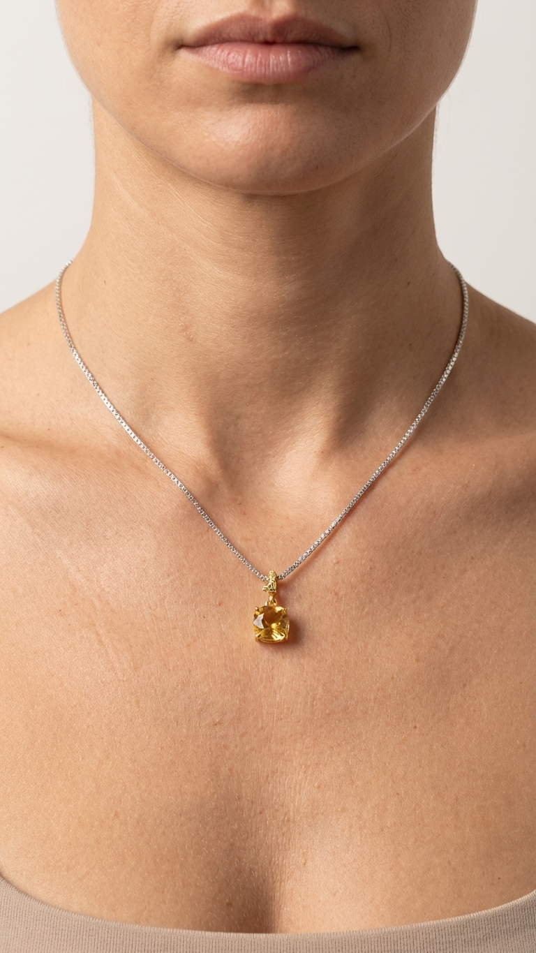 El citrino es la piedra de la abundancia y la energía positiva. En esta joya, la gema ha sido tallada para maximizar sus reflejos dorados, creando un punto de luz constante en tu cuello. El colgante cuenta con un acabado en baño de oro que realza el tono amarillento natural de la piedra, aportando una calidez excepcional.