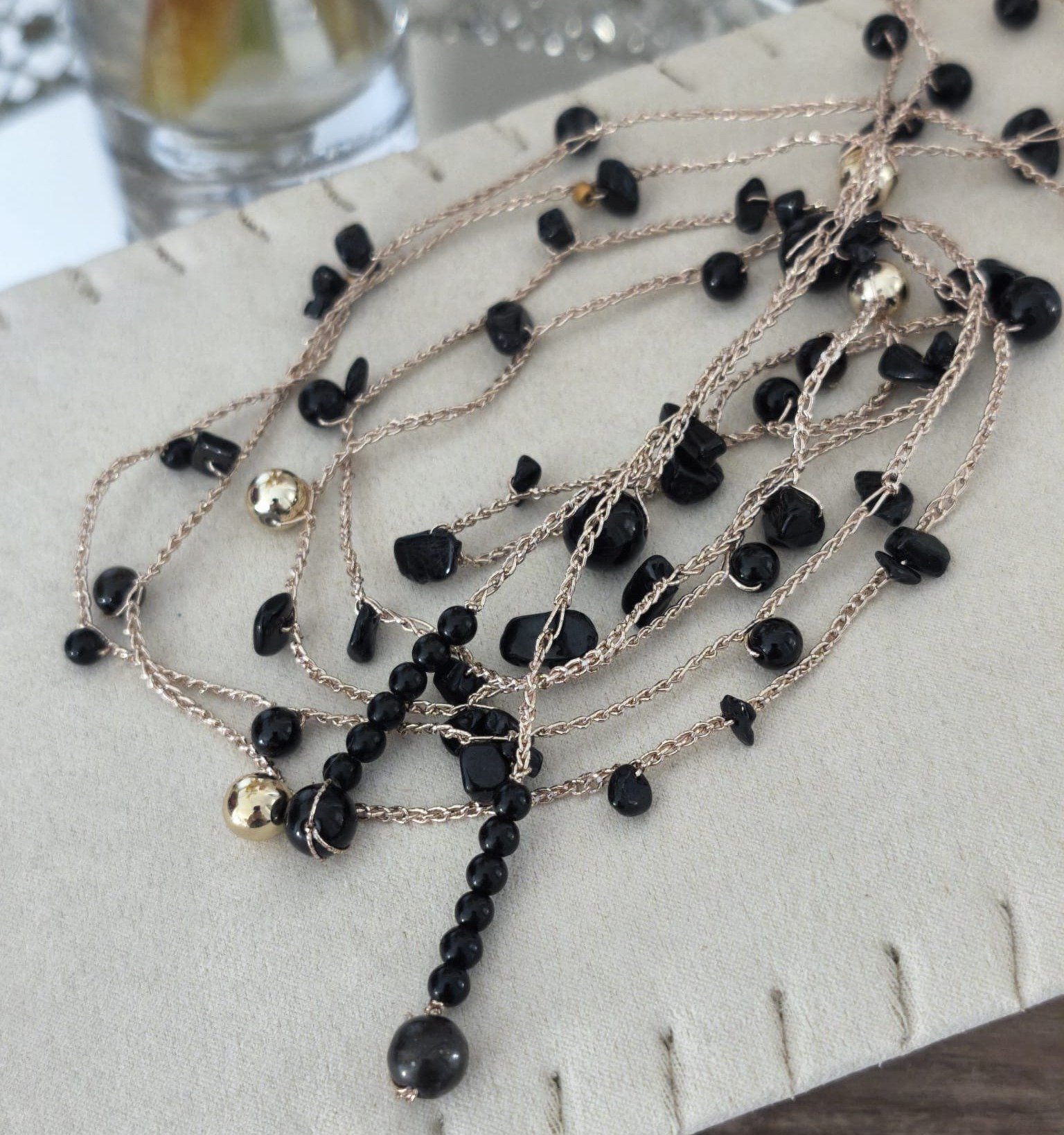 Inspirado en la tendencia Infinity, llega en obsidiana y dorado. Collar extremadamente versátil y ligero, elabordo en materiales sintéticos lo que lo hace apto para personas con alergías a metales.