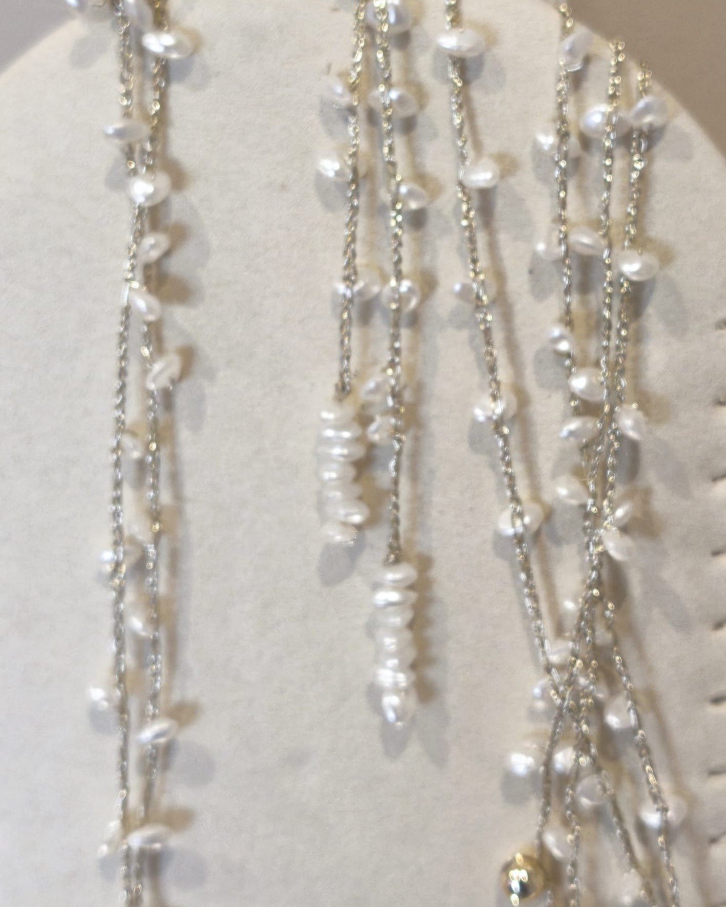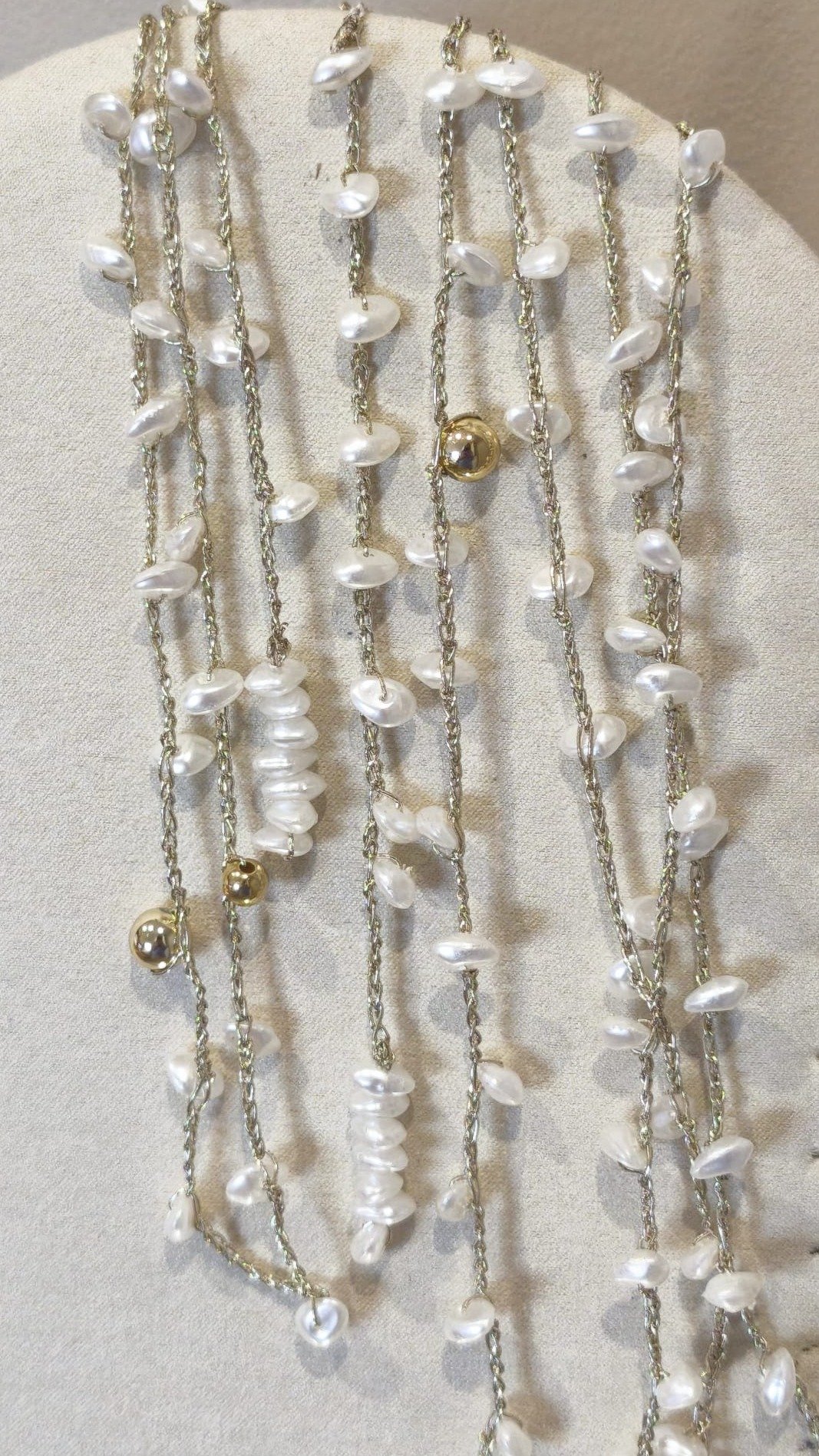 Inspirado en la tendencia Infinity, llega en perla sintetica y dorado. Collar extremadamente versátil y ligero, elabordo en materiales sintéticos lo que lo hace apto para personas con alergías a metales.