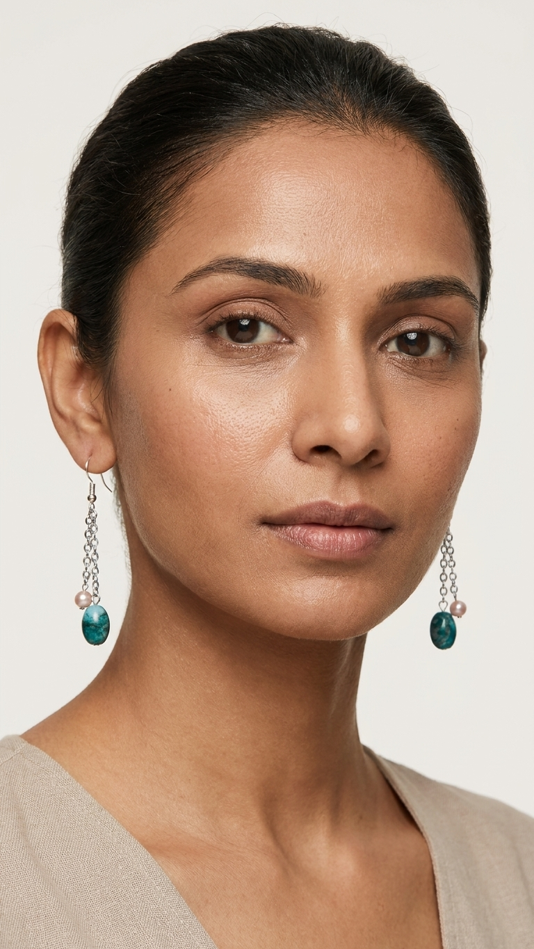 La cadena doble plateada da caída y movimiento sin añadir volumen, creando esa línea vertical limpia que alarga el cuello y enmarca el rostro. El gancho de plata remata la pieza en la parte superior con la coherencia tonal justa: todo en la misma familia de plateados fríos que dialogan perfectamente con el azul de la amazonita.