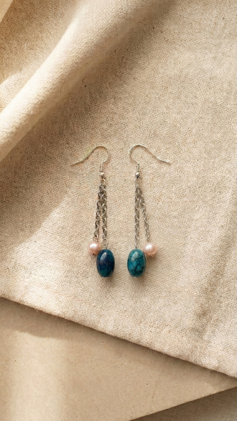 Pendientes asimétricos de amazonita azul y perla de río natural con cadena doble en acero inoxidable plateado y gancho en plata 925. Diseño delicado de gran caída con contraste azul mineral y blanco nacarado. Aptos para pieles sensibles.