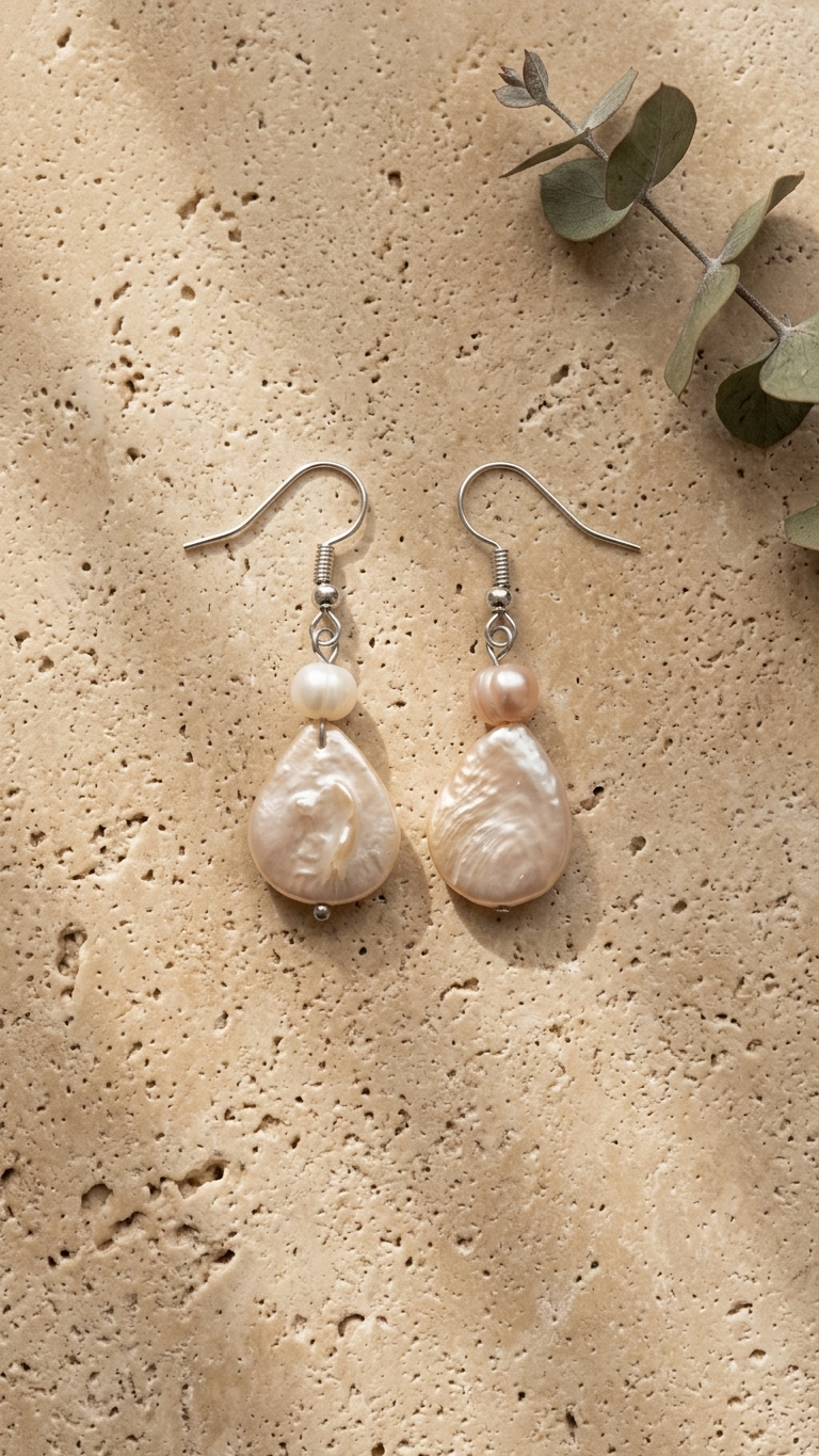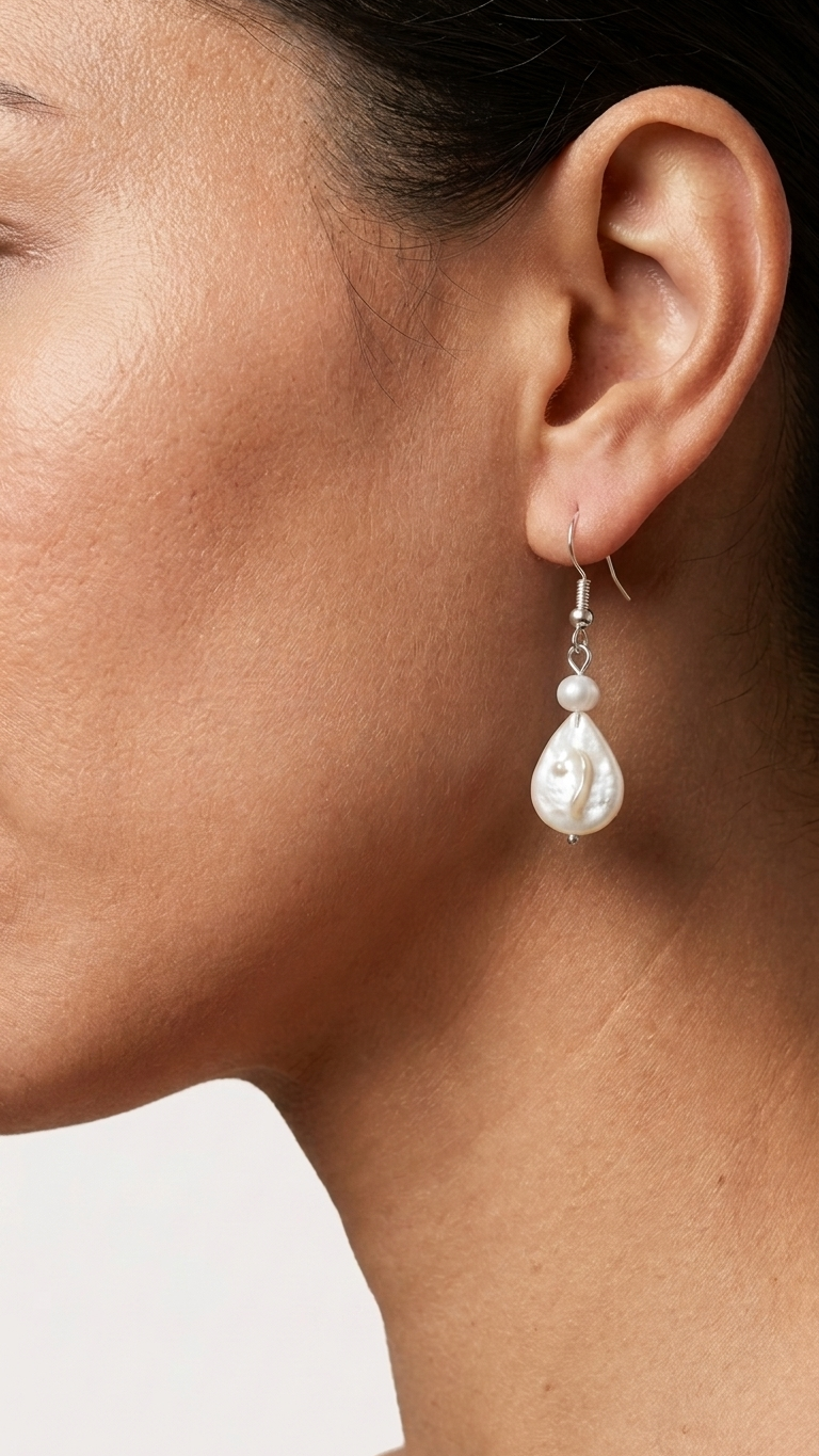 Pendientes colgantes de perla barroca de río natural de gran tamaño con perla de río pequeña y gancho en plata de ley 925. Todo en blanco nacarado puro. Minimalismo orgánico de gran presencia. Aptos para pieles sensibles.