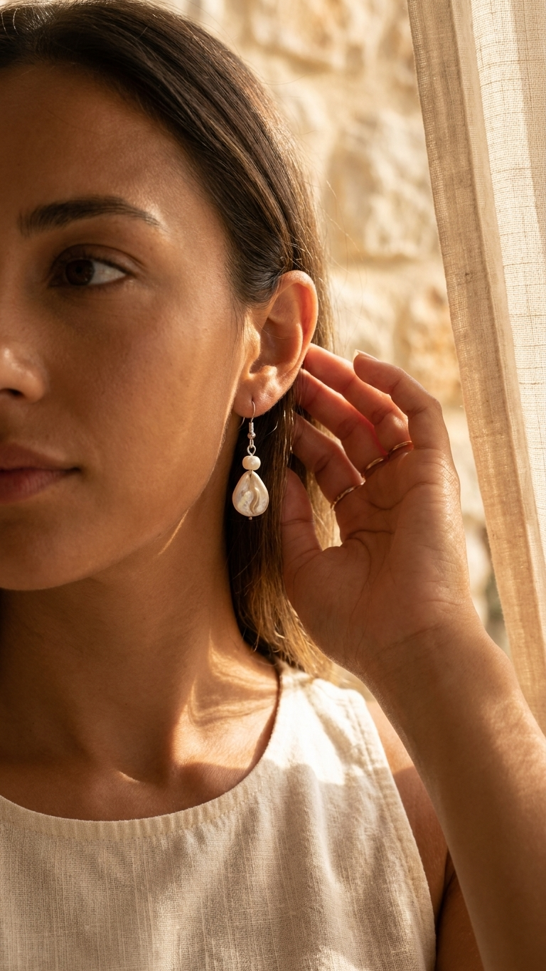 Cuando el material es perfecto, el diseño no necesita añadir nada. Los pendientes Bianco lo demuestran con una elegancia que desarma: una perla de río pequeña y redonda en la parte superior, una perla barroca de gran formato en la inferior, un gancho de plata de ley 925 que las sostiene. Tres elementos, un solo color, toda la sofisticación del mundo.