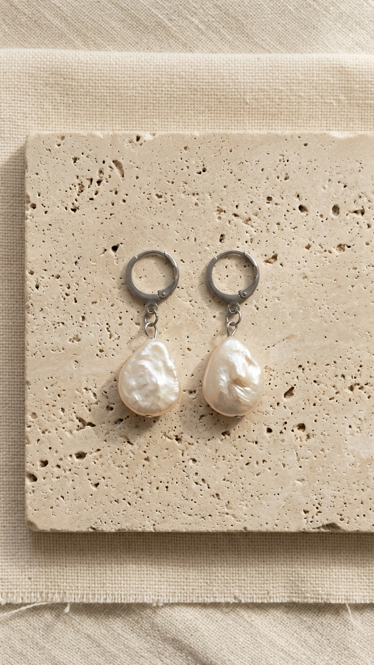 Hay combinaciones que nunca fallan y la perla barroca sobre aro huggie es una de ellas. Los pendientes Fiume la ejecutan con la precisión justa: un aro mini de acero inoxidable plateado —pequeño, pegado al lóbulo, con ese cierre de palanca que entra y sale en un clic— del que cuelga, libre y con movimiento propio, una perla barroca de río natural de gran formato.