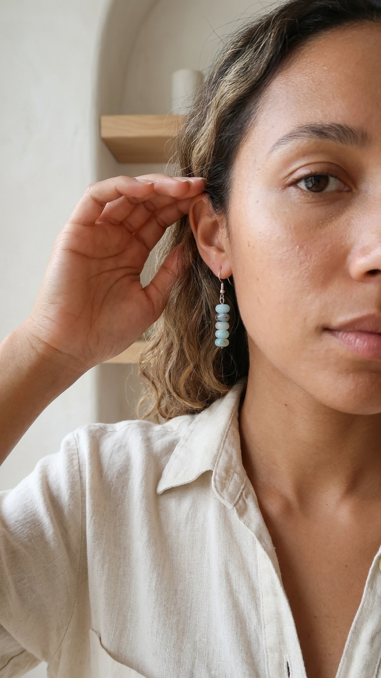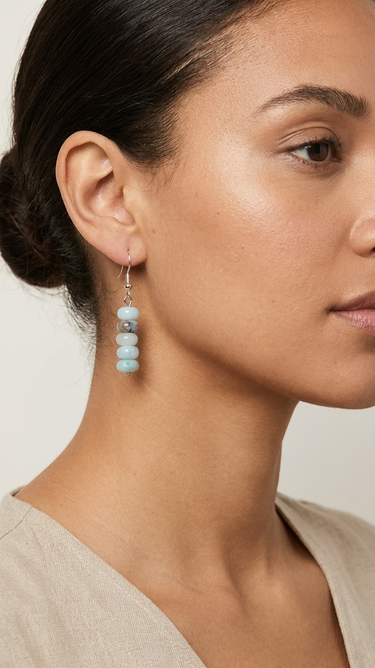 A veces la mejor decisión de diseño es no tomar ninguna: dejar que la piedra hable sola. Los pendientes Pacific hacen exactamente eso: cinco rondelas de amazonita aguamarina apiladas una sobre otra en columna vertical, cada una con ese azul cielo pálido y translúcido que hace de esta piedra una de las más serenas de la naturaleza.