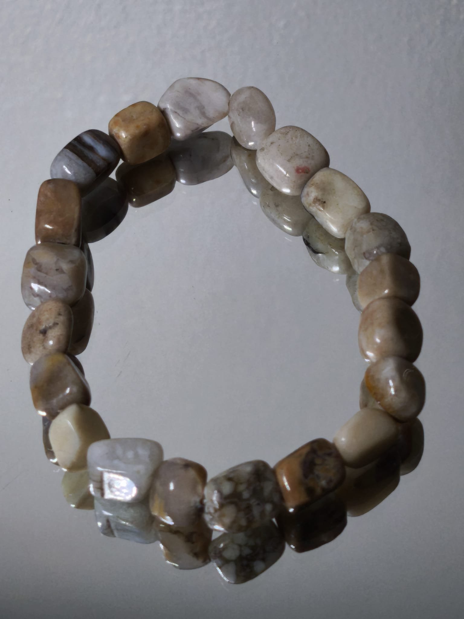 Pulsera elaborada con cuentas de Ágata Hoja de Bambú de unos 8 mm montadas en un elástico de gran calidad que se adapta cómodamente a tu muñeca.