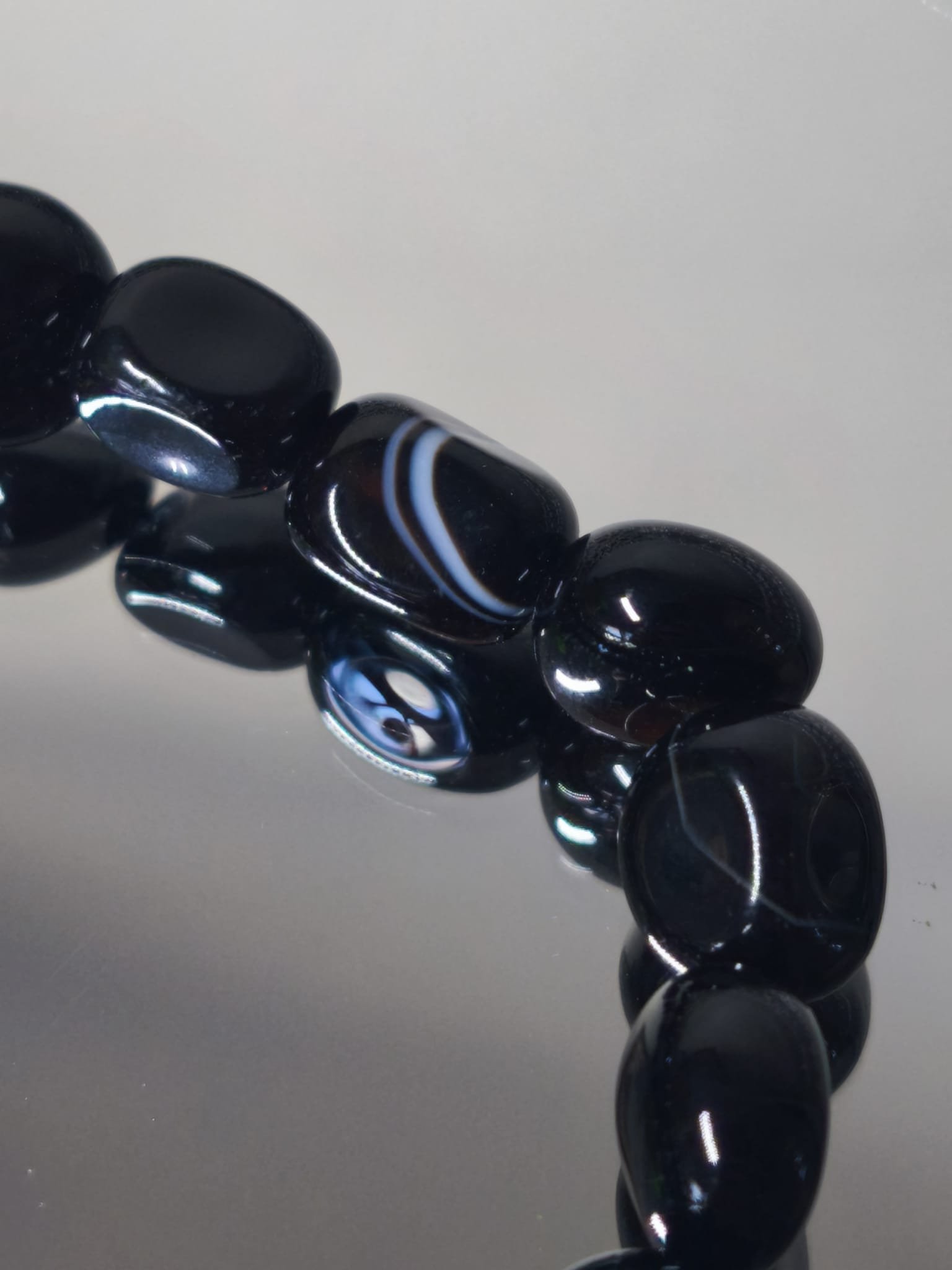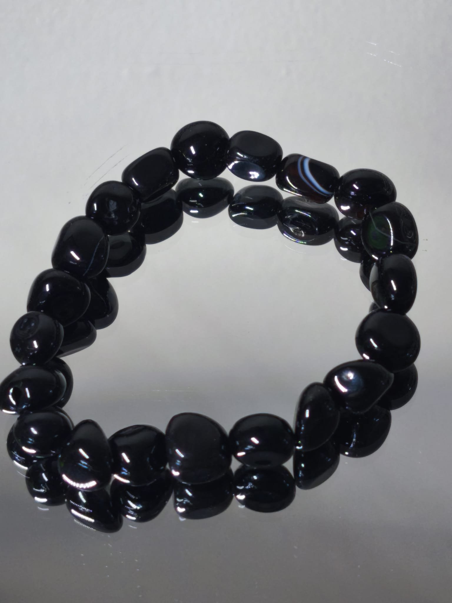 Pulsera elaborada con cuentas de ágata negra irregular de un tamaño aproximado de 8 mm montadas en un elástico de gran calidad que se adapta perfectamente a la muñeca.