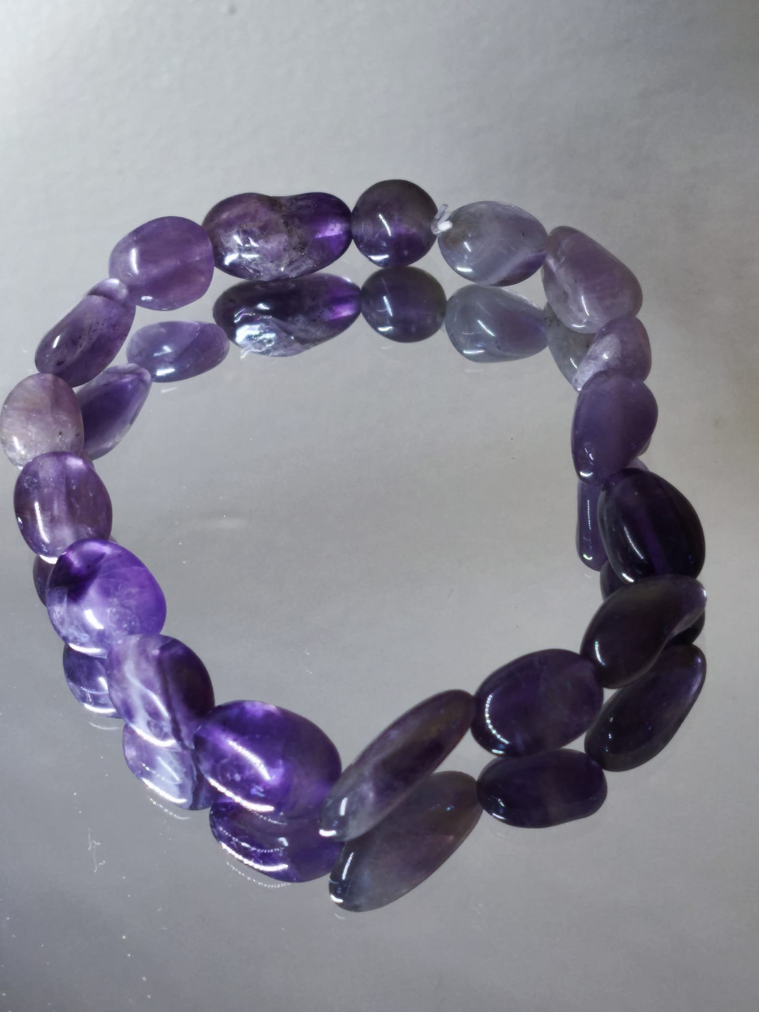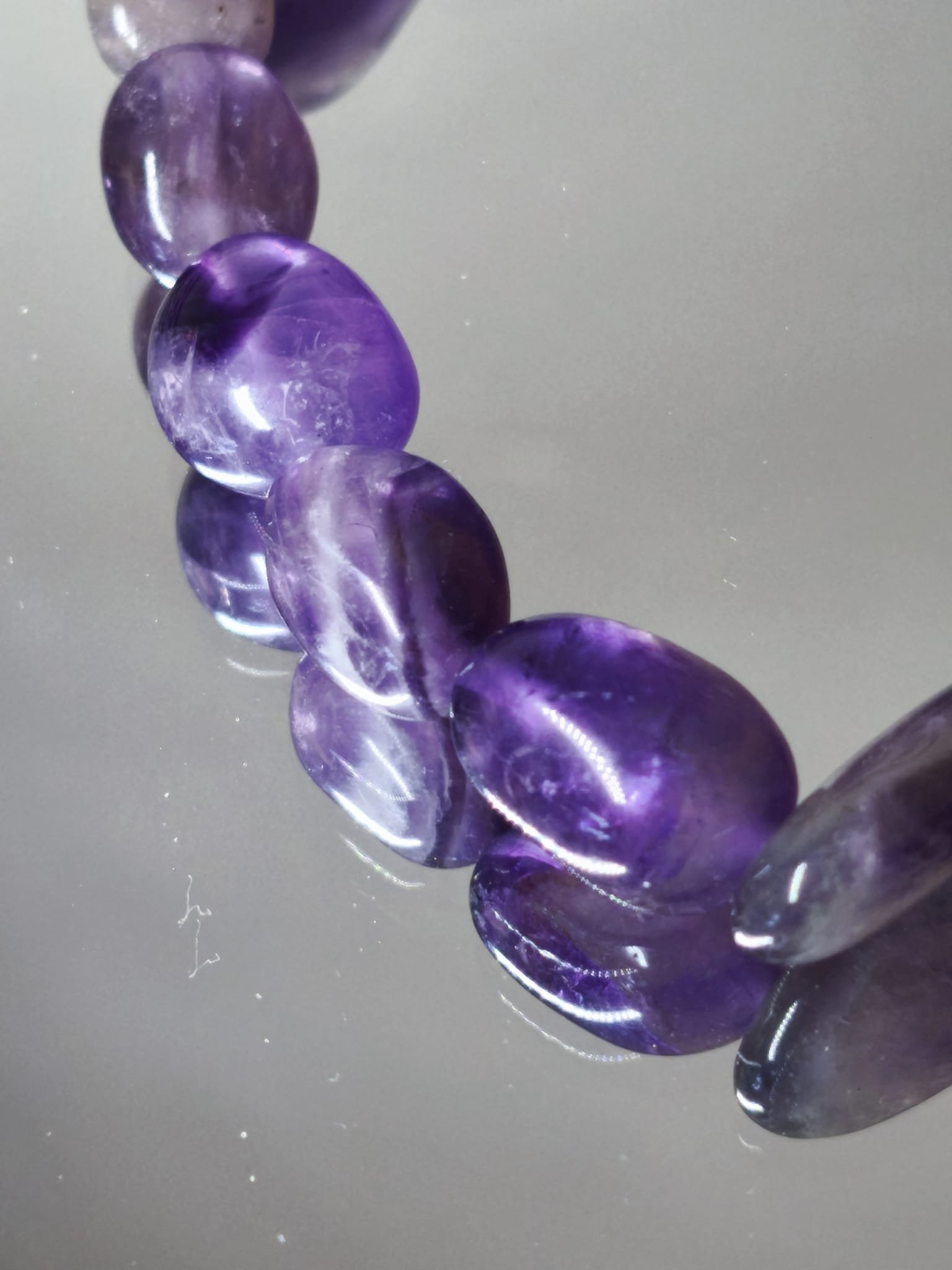 Pulsera elaborada con cuentas de amatista irregular de un tamaño aproximado de 8 mm montadas en un elástico de gran calidad que se adapta cómodamente a tu muñeca.