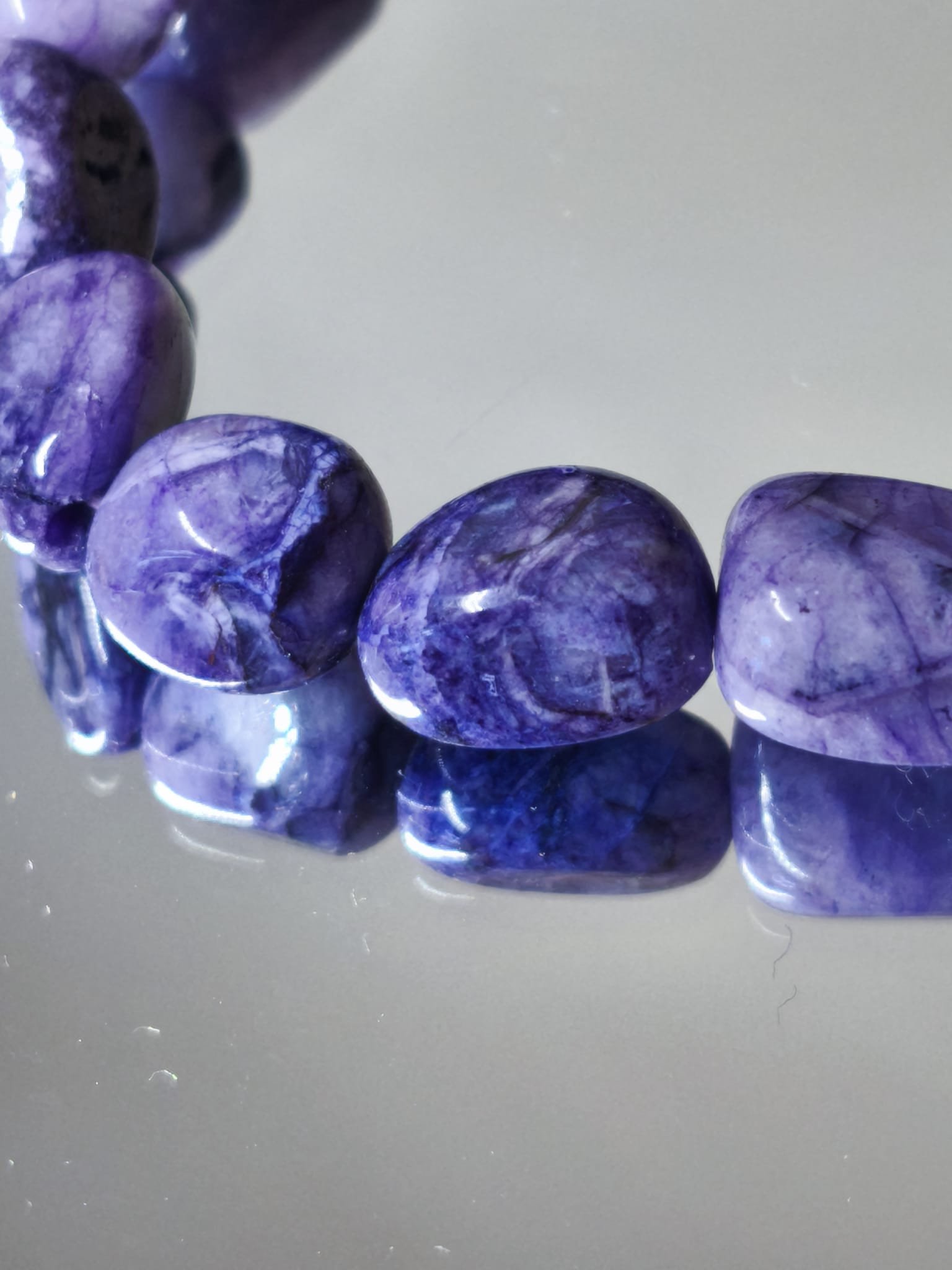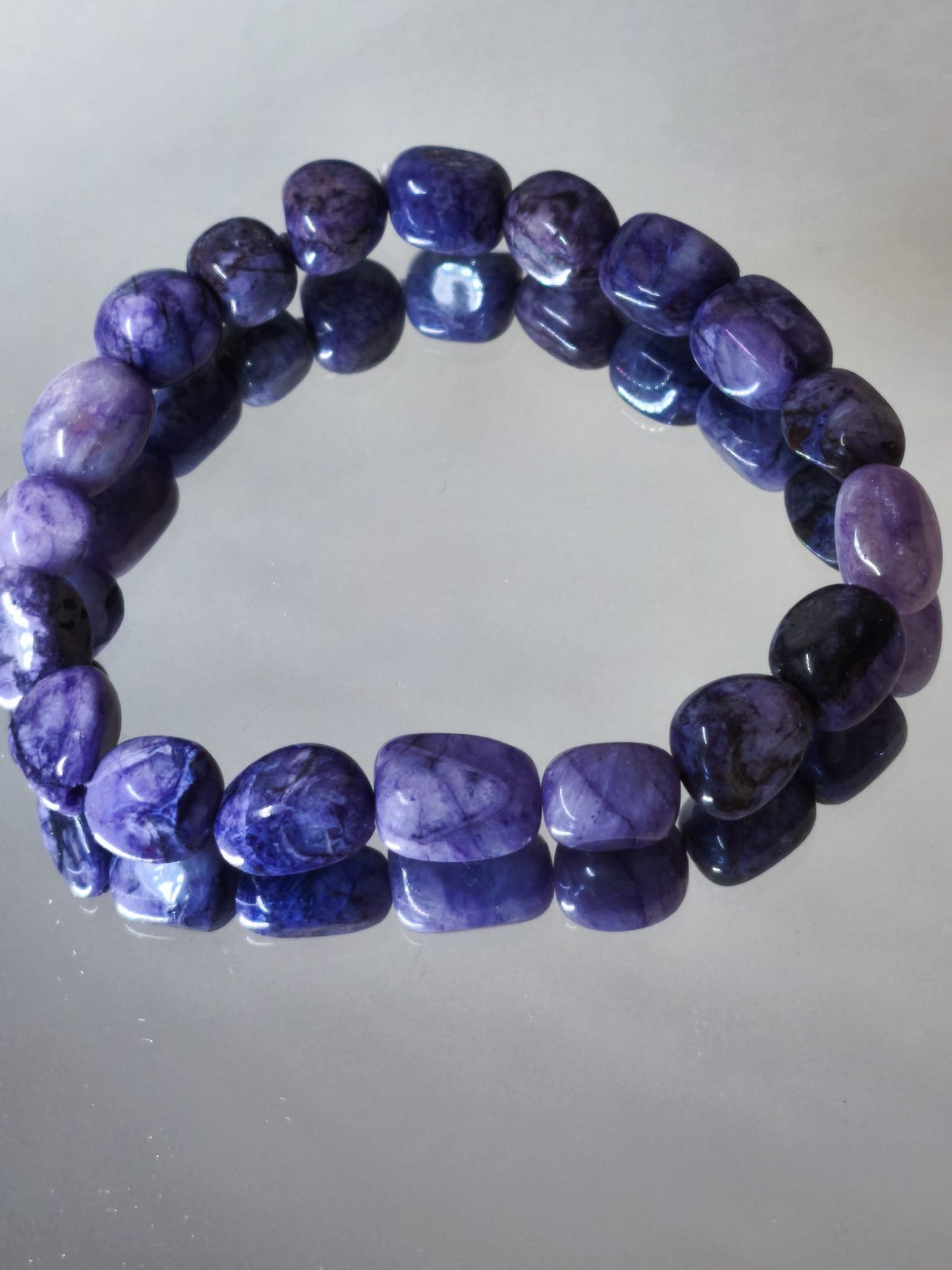 Pulsera elaborada con cuentas de charoita irregular de un tamaño aproximado de 8 mm montadas en un elástico de gran calidad que se adapta perfectamente a la muñeca.