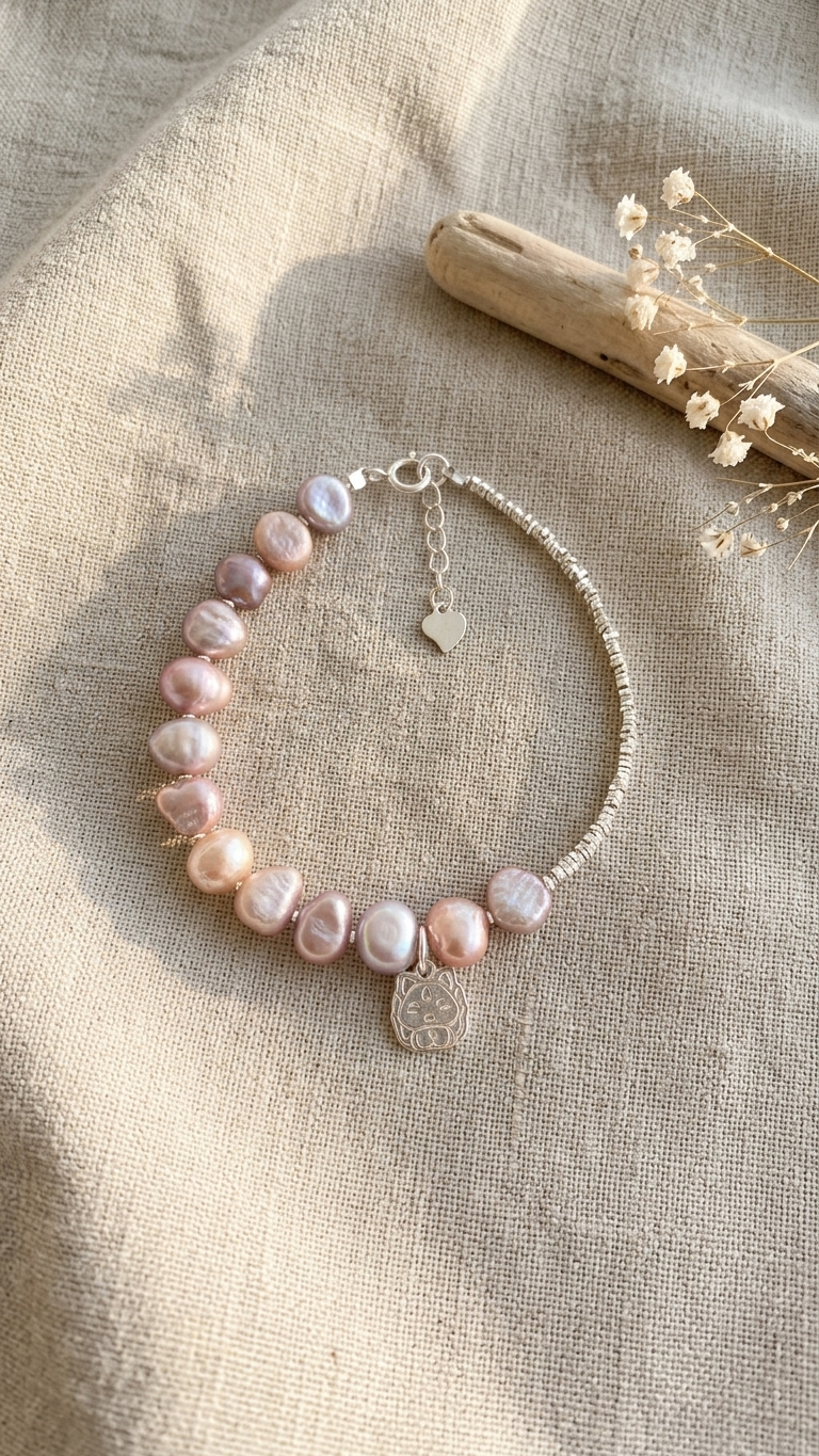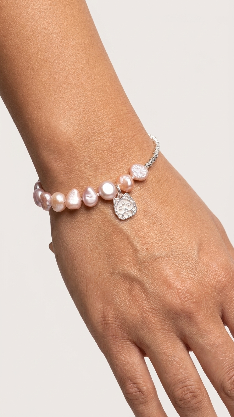 La mitad de la banda está construida con perlas de río naturales en esa paleta de rosas, melocotones y malvas suaves que solo da la perla natural — orgánica, irregular y nacarada. La otra mitad, con espaciadores de plata de ley 925 texturizados que aportan brillo y ligereza. Un contraste entre lo natural y lo trabajado que funciona perfectamente.